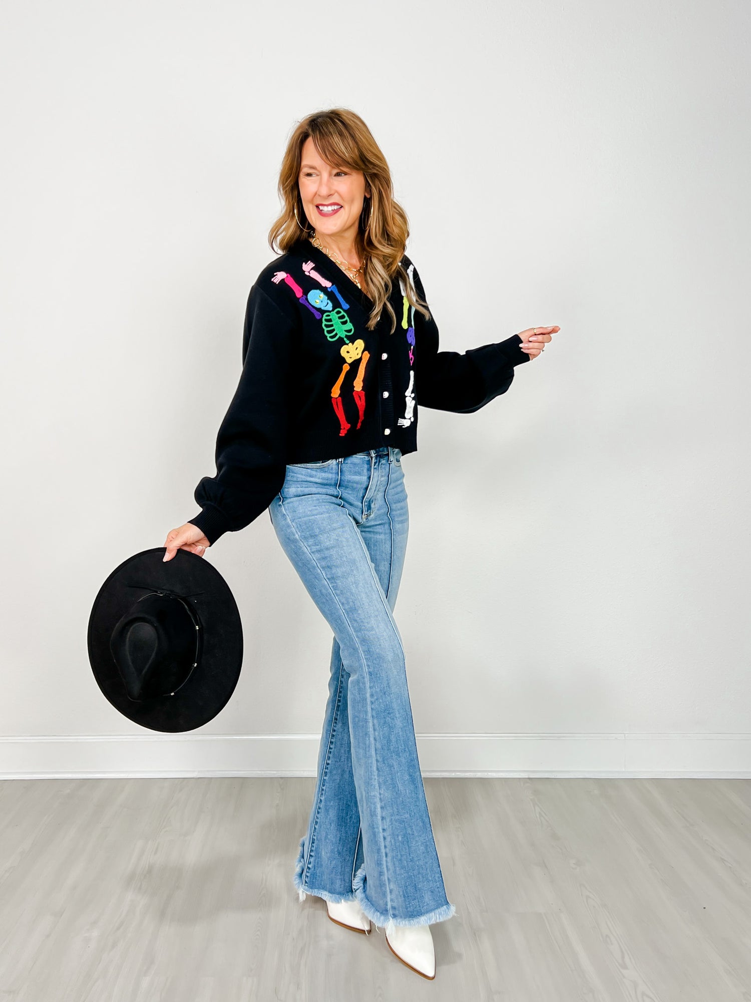 The Queen of Sparkles Black Rainbow Skeleton Button Up Cardigan adds playful energy to spooky season style. Featuring colorful rainbow sequin skeletons across a classic black knit, this cardigan brings festive fun with signature sparkle. The button-front design and relaxed fit make it easy to layer over tanks, tees, or dresses, while the vibrant details shine with every move. Perfect for Halloween festivities, seasonal events, or simply adding a touch of sparkle to your everyday wardrobe, this piece is a bold statement of comfort and style.