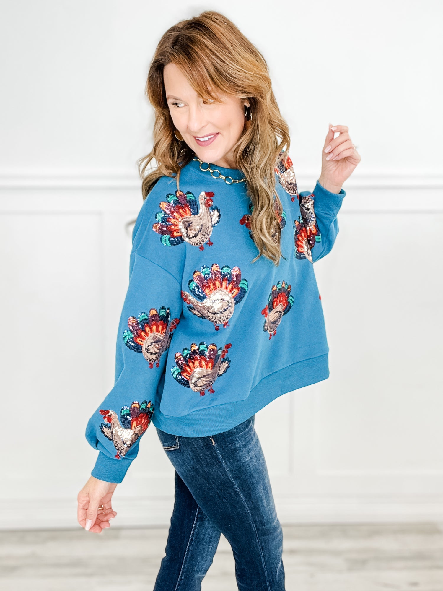 Queen of Sparkles Dark Teal Beaded Turkeys All Over Sweatshirt