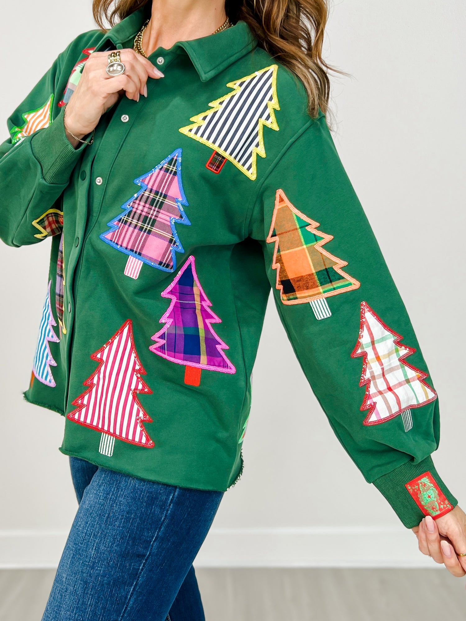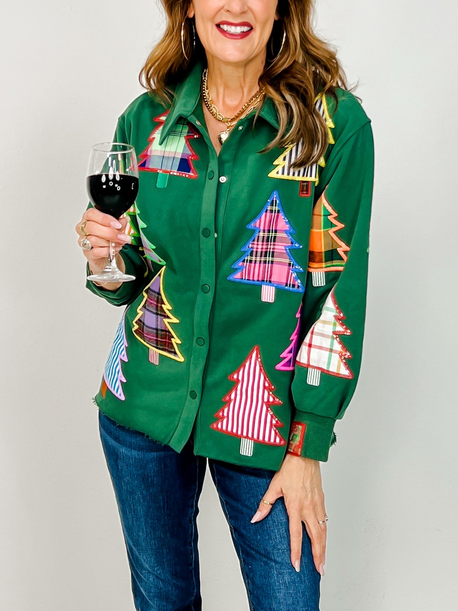 Go big, go bright, and go full sparkle mode! This Queen of Sparkles Green Christmas Tree Button-Up is a festive favorite, featuring bold sequin Christmas trees in every color of the season. The classic button-up silhouette keeps it easy to style — wear it open over a tank, tucked into denim, or tied at the waist for a playful holiday twist. It’s that perfect piece that says “effortless,” but still sparkles from every angle.
