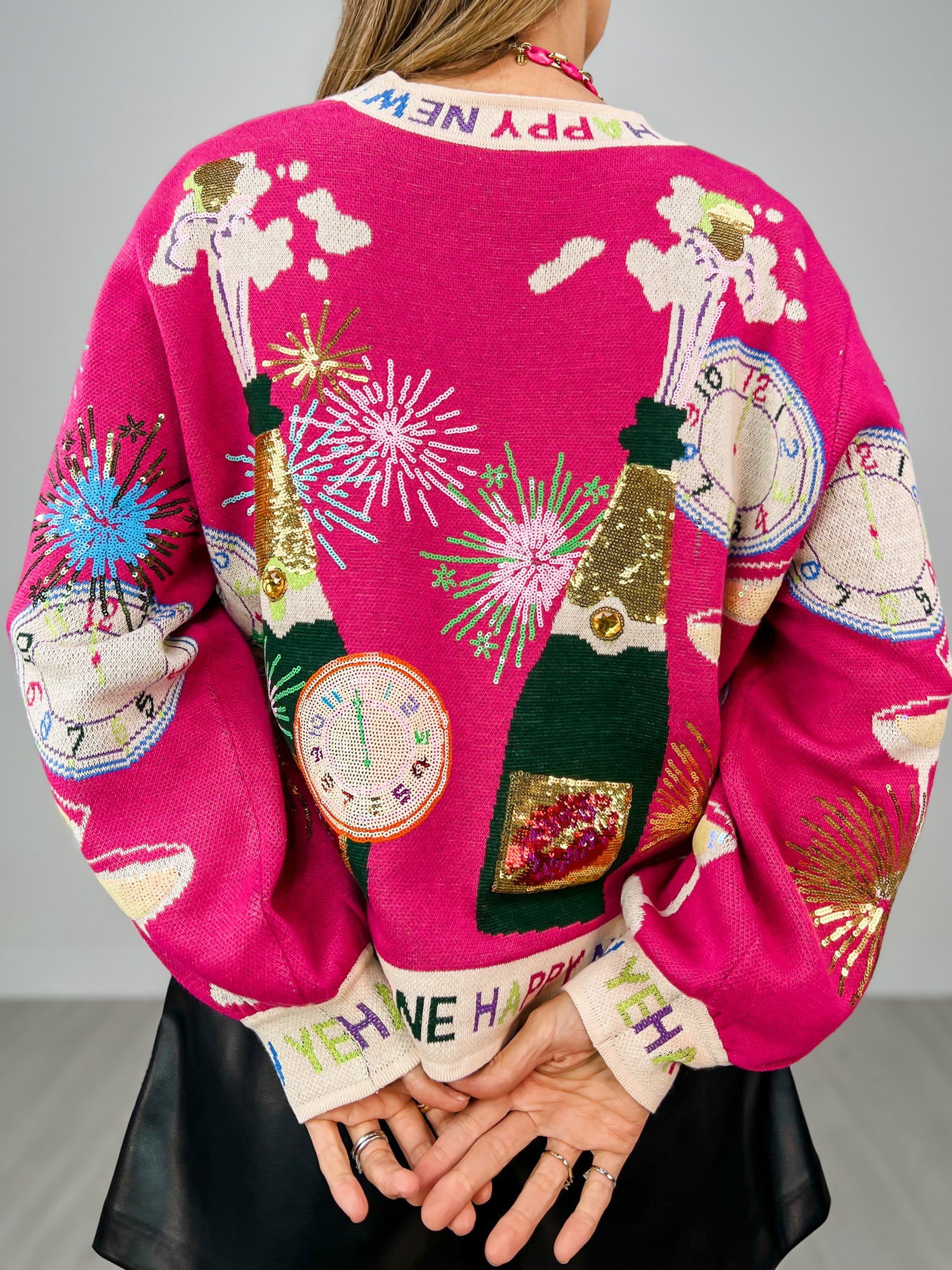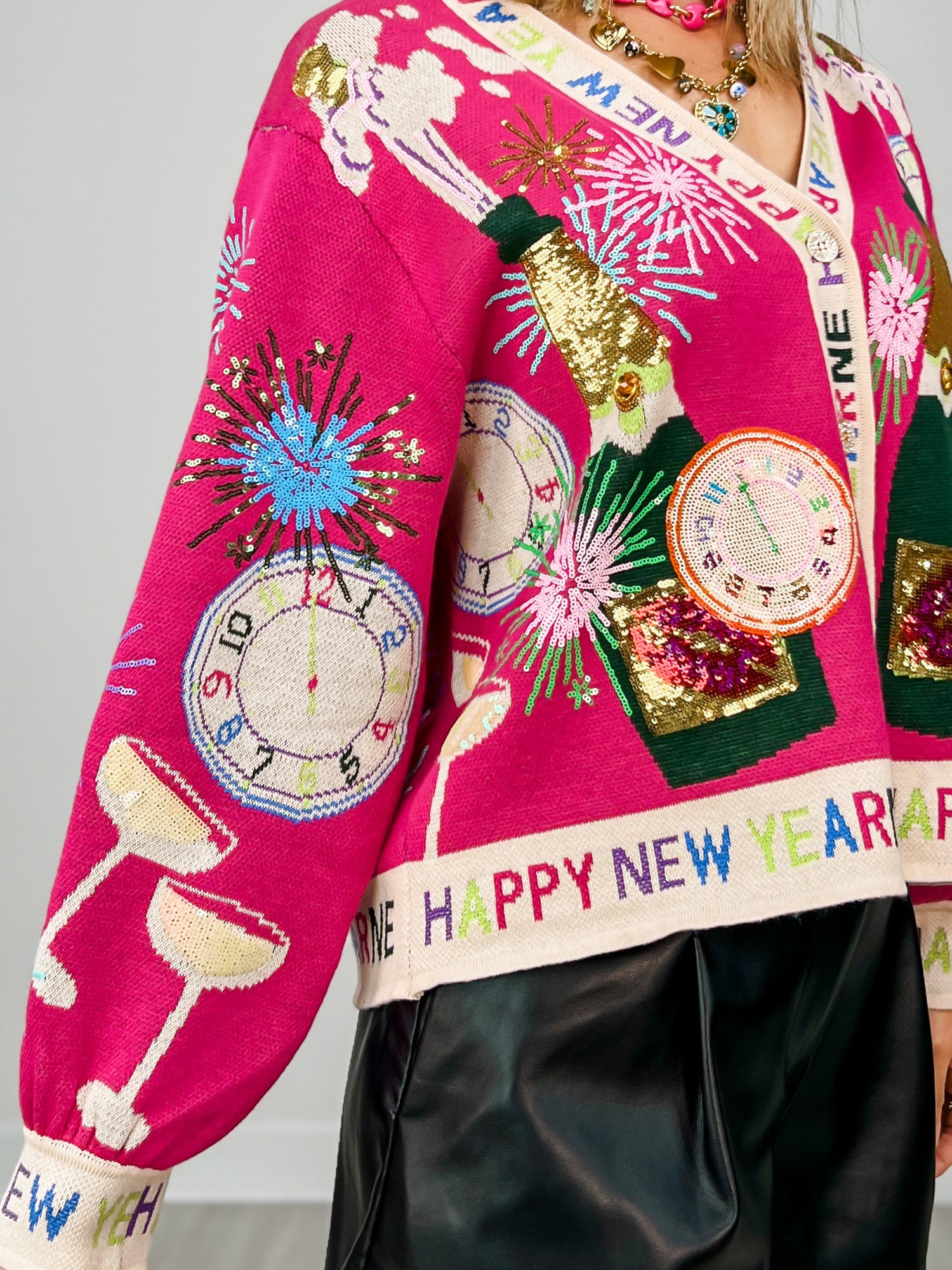 Ring in the new year with maximum glamour in this Queen Of Sparkles NYE Icon Button Up Cardigan. Covered in eye-catching sparkles and festive details, this statement piece transforms any outfit into a celebration-ready look. The classic button-up silhouette keeps things wearable while the shimmering embellishments steal the show. Perfect for holiday parties, New Year's Eve events, or whenever you want to feel like the star of the night. Layer it over your favorite dress or pair with jeans for instant sparkle-powered style.