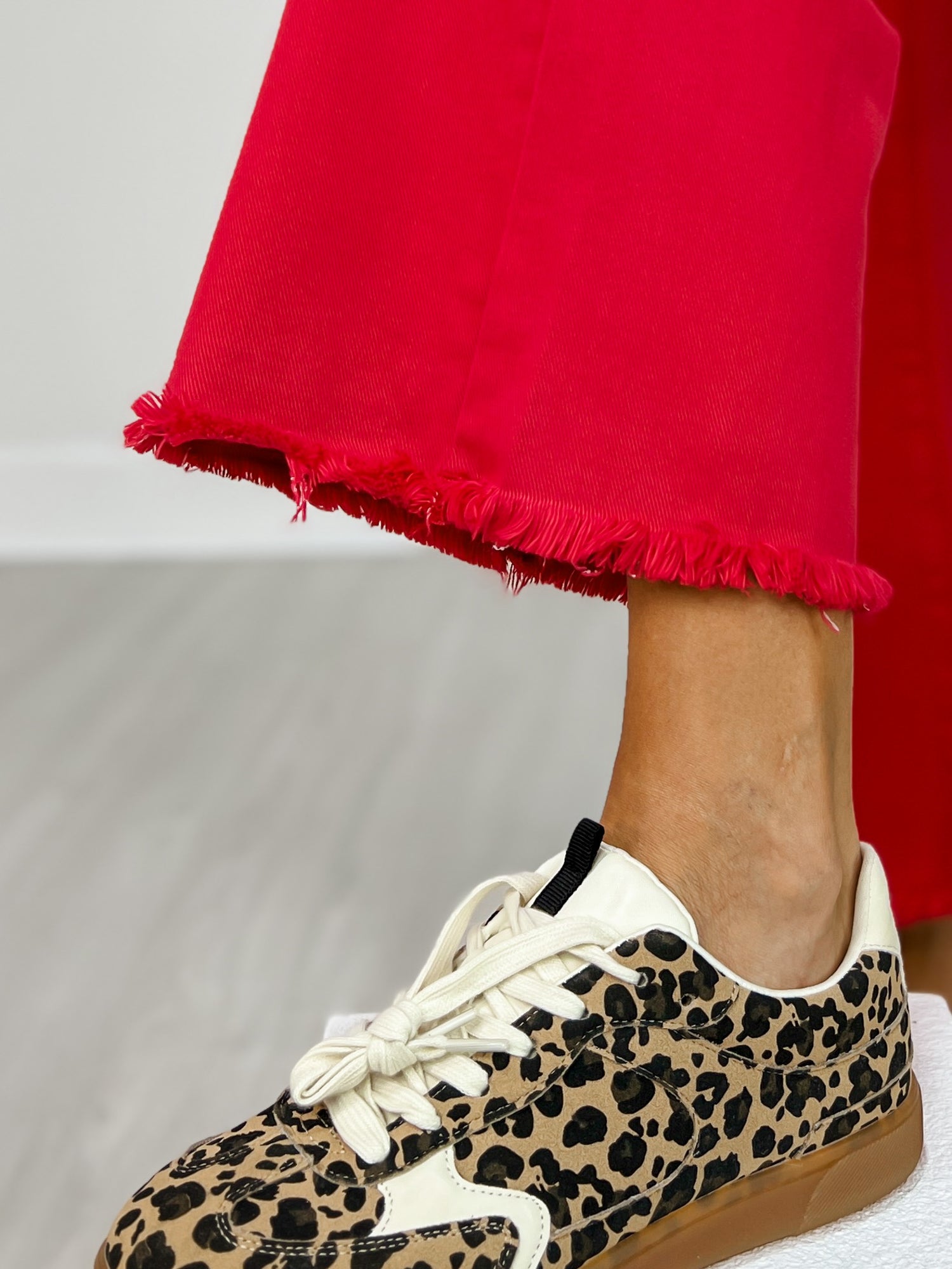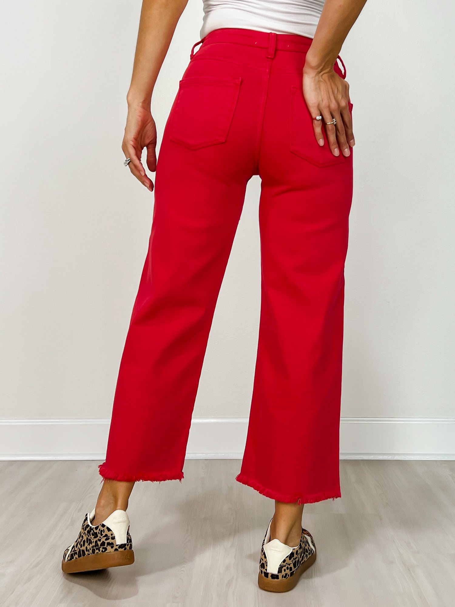 Make a bold statement with these vibrant red wide-leg jeans. Designed with a flattering high-rise fit, these pants feature classic five-pocket styling and a cropped length, complemented by raw, frayed hems for an edgy finish. Perfect for adding a pop of color to your wardrobe, these jeans pair effortlessly with heels, sneakers, or boots.