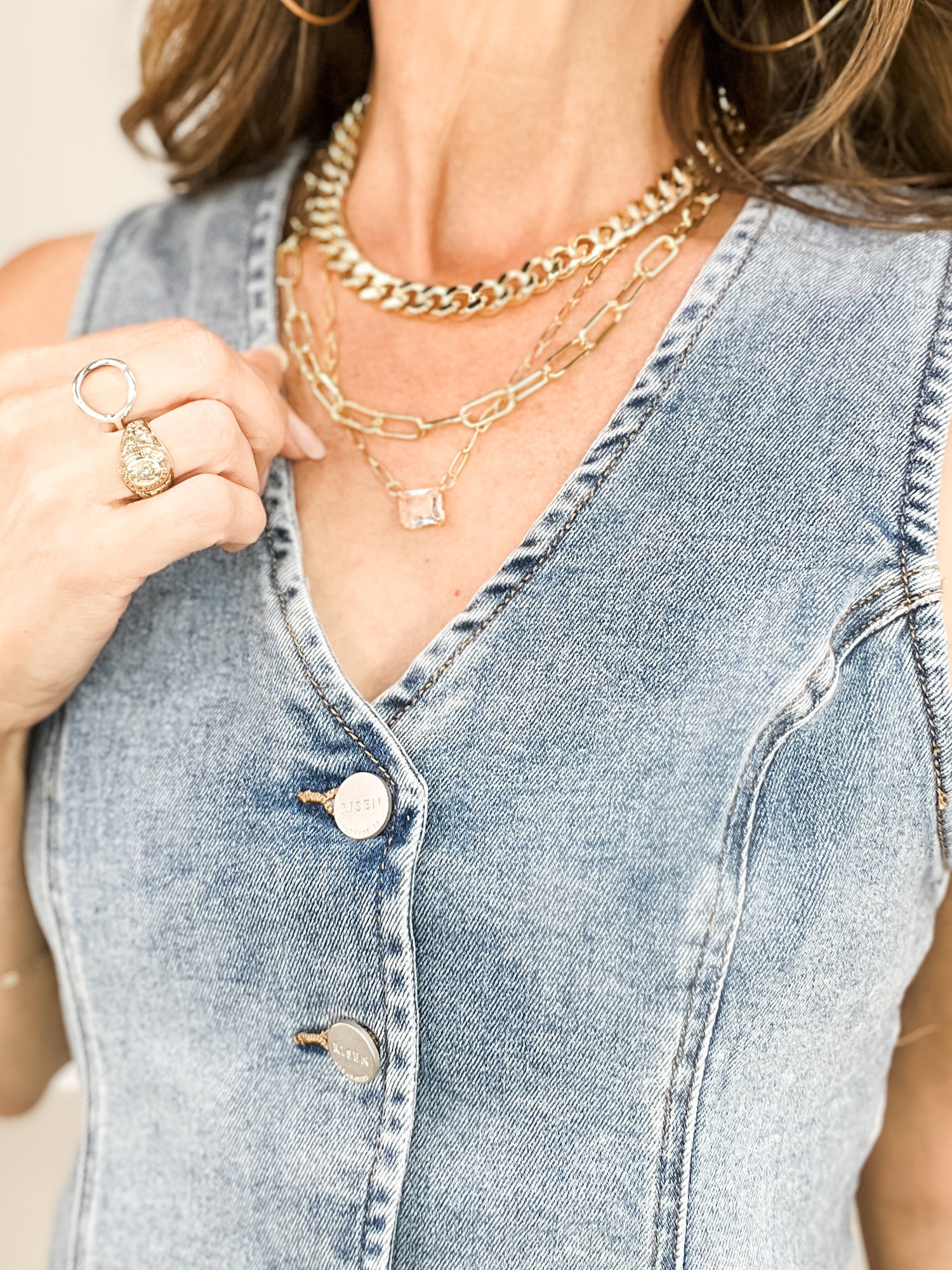 Risen V-Neck Denim Sleeveless Button Down Vest
