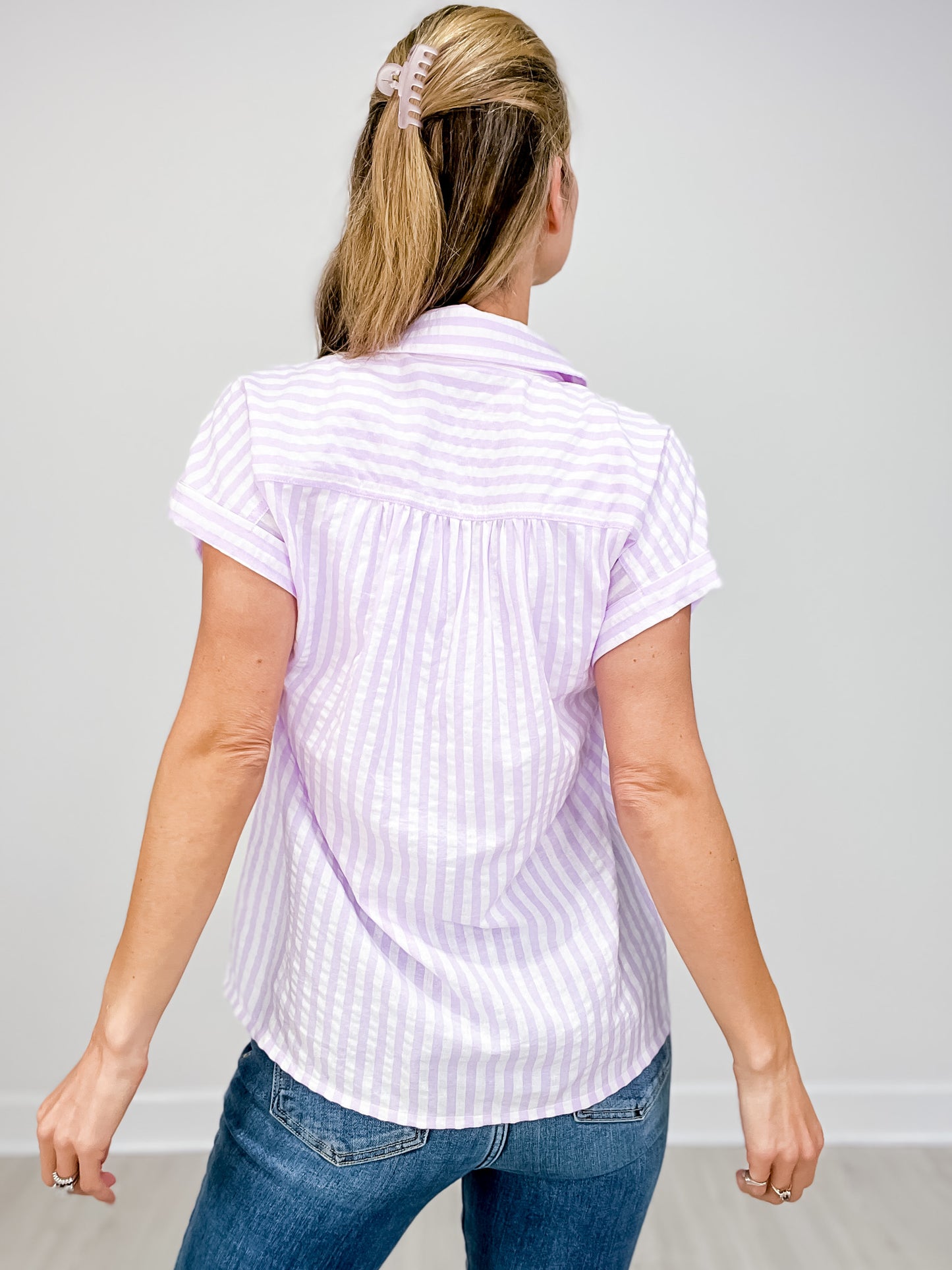 Elevate your summer wardrobe with our Roll Tap Short Sleeve Seersucker Striped Top! A versatile and stylish addition, this top features a unique roll tap design and seersucker stripes that add a touch of texture. Lightweight and comfortable, it's perfect for any summer occasion. Upgrade your wardrobe today!