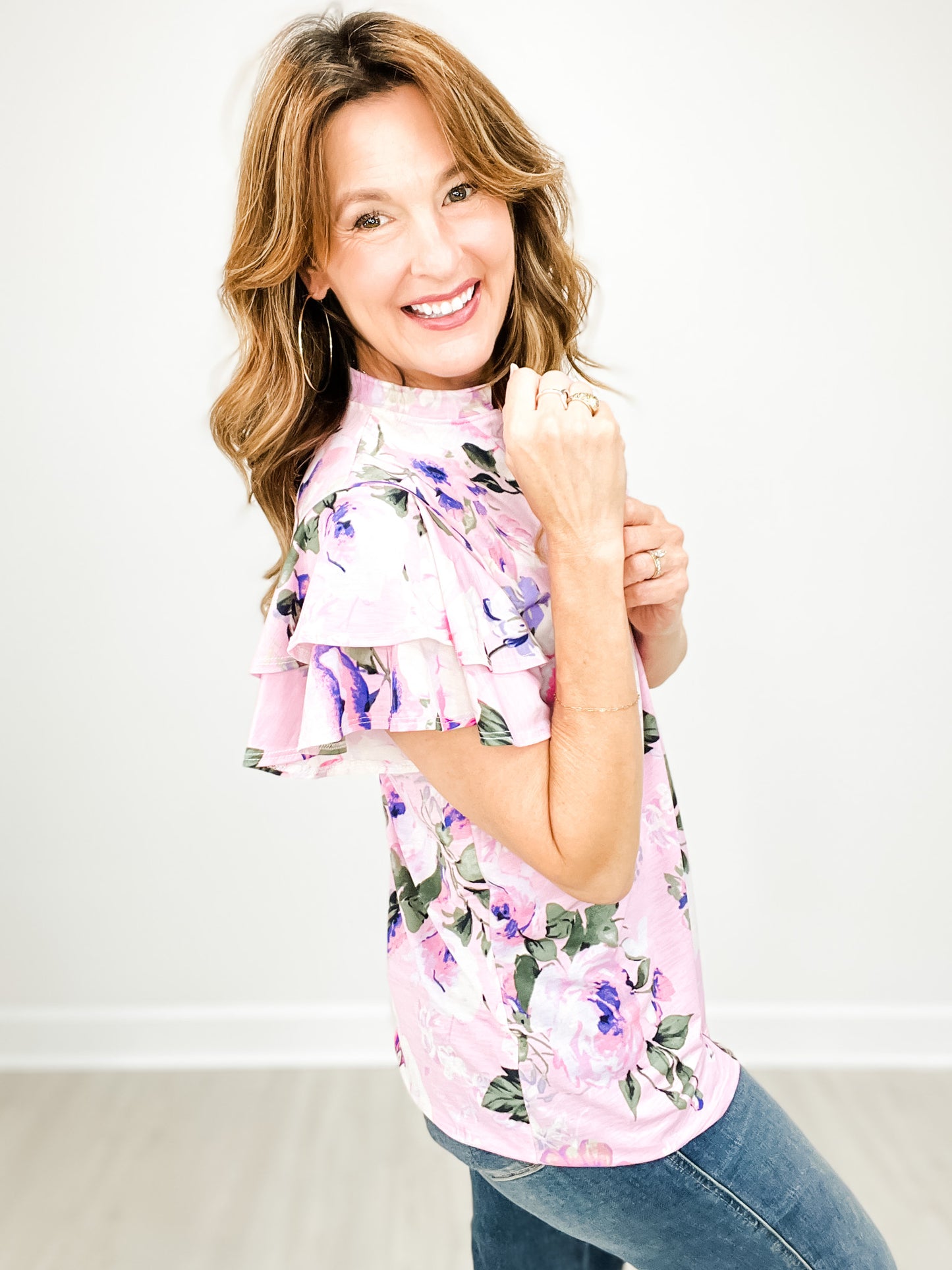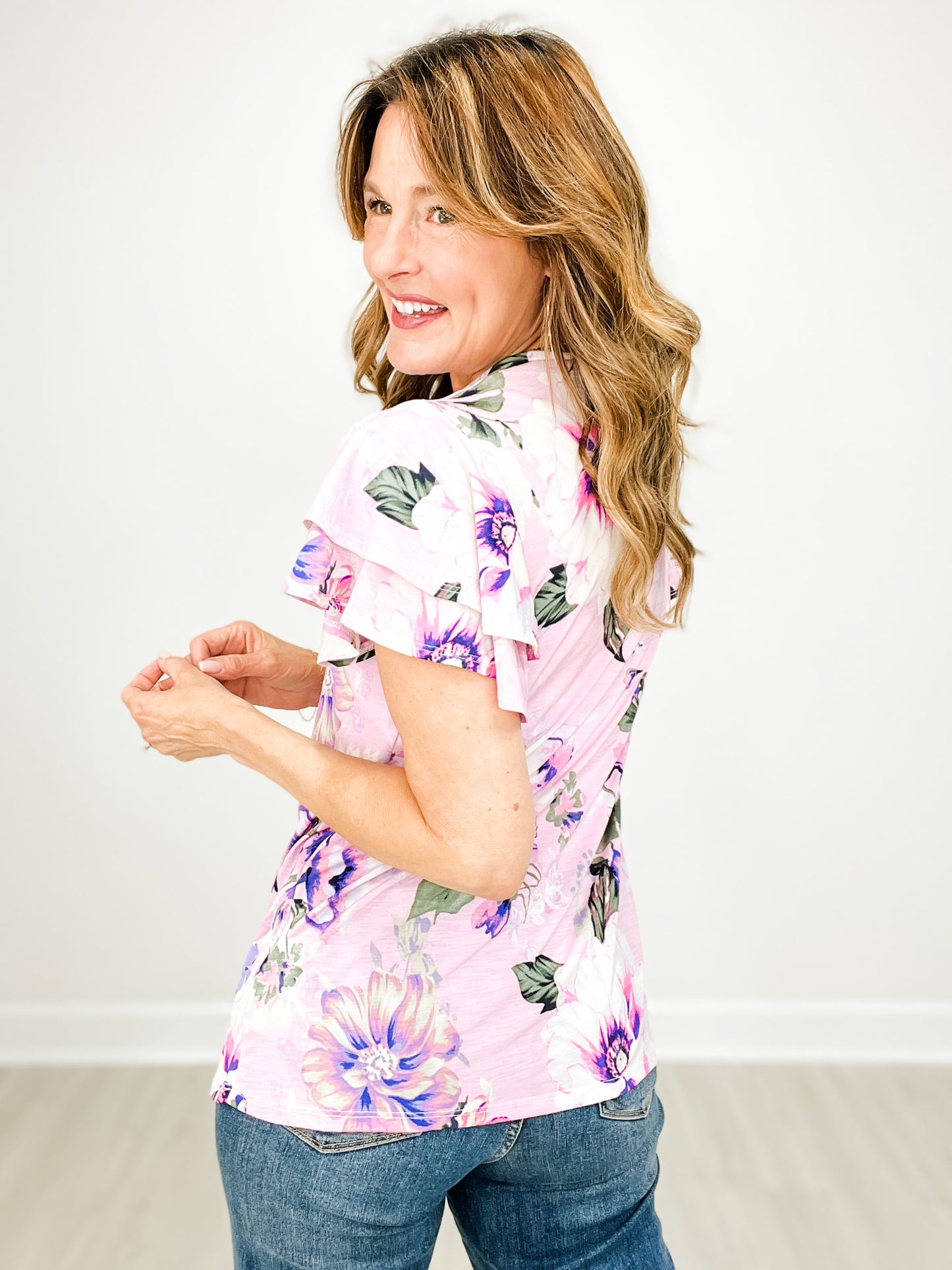 Add a touch of elegance to your wardrobe with our Ruffle Sleeve Top. Its unique design features delicate ruffles and floral print accents, giving you a stylish and feminine look. Perfect for any occasion, this top will definitely become a go-to piece in your closet.