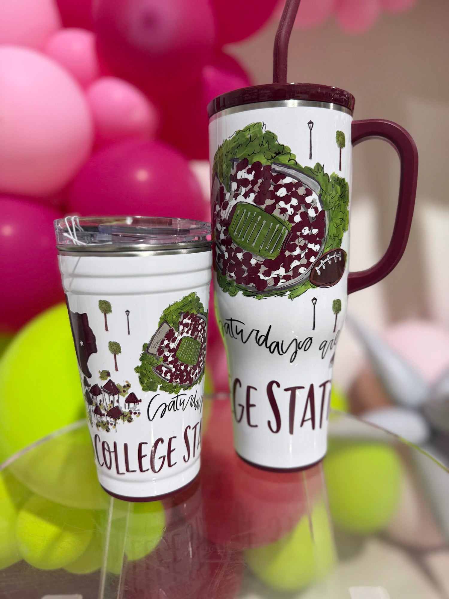 Party-Ready! 🥳🥤 Saturdays are for Football and Tailgates! These one of a kind designs by Rachel Walker display what makes your college town so special on a Saturday!