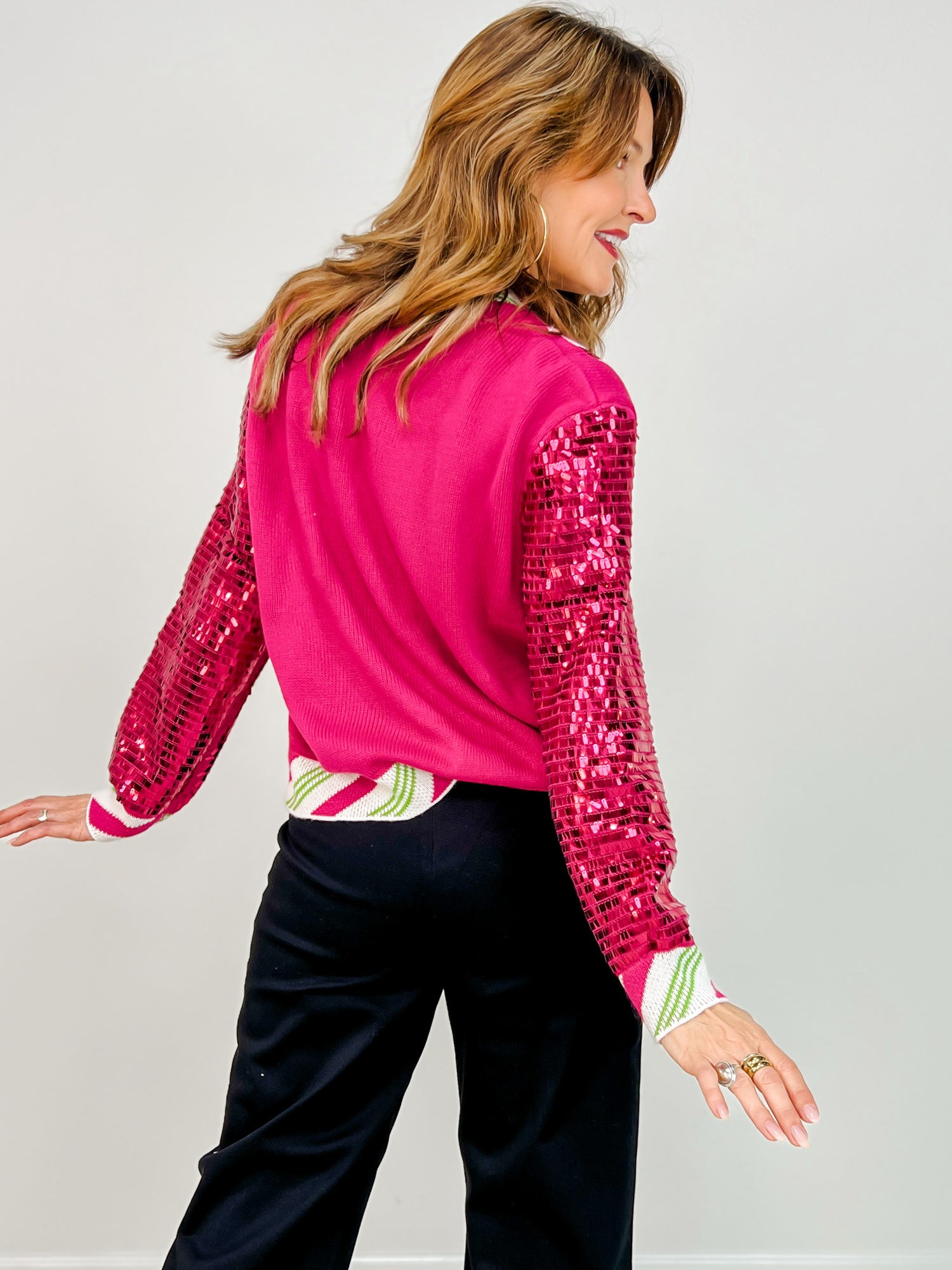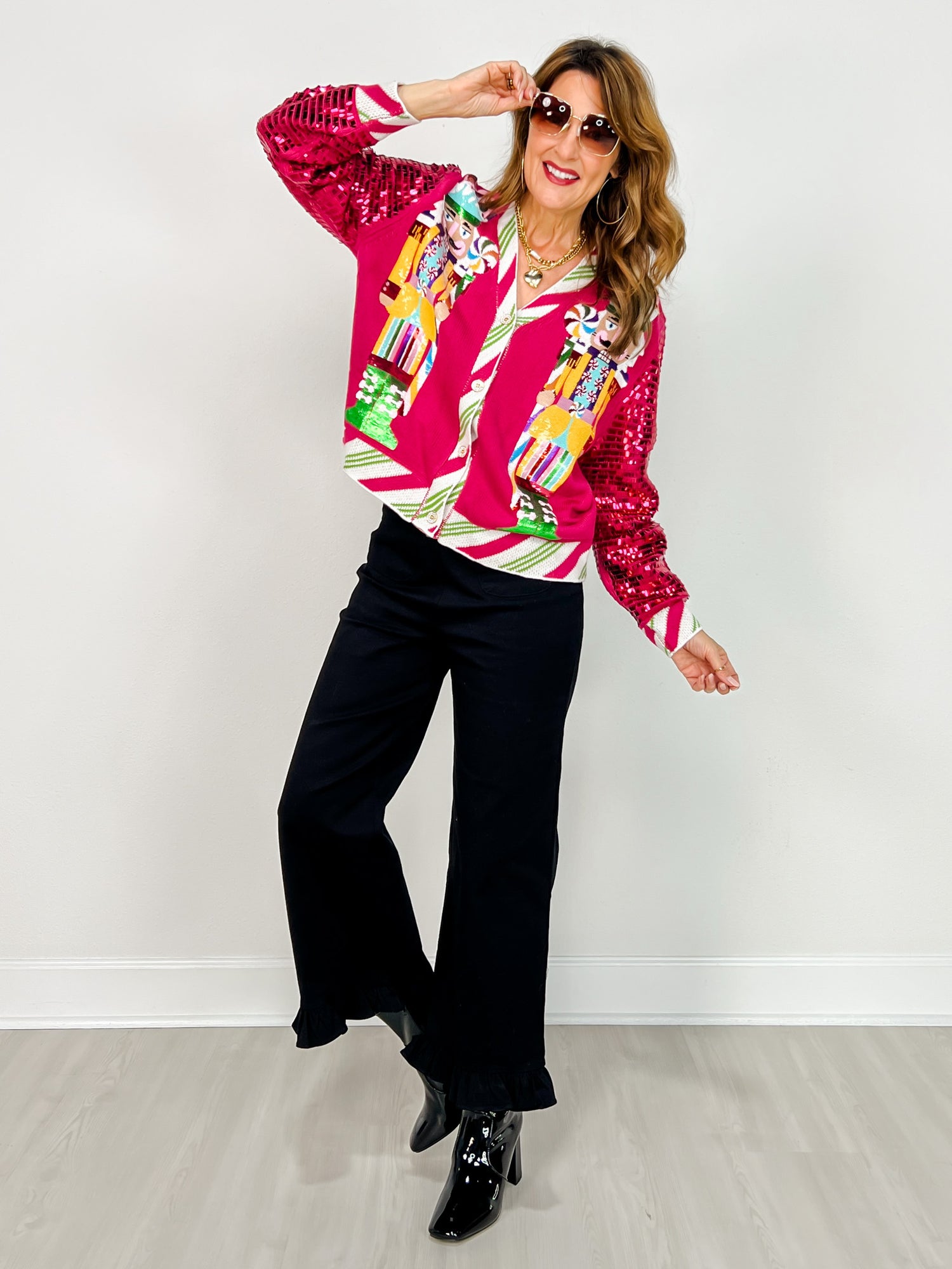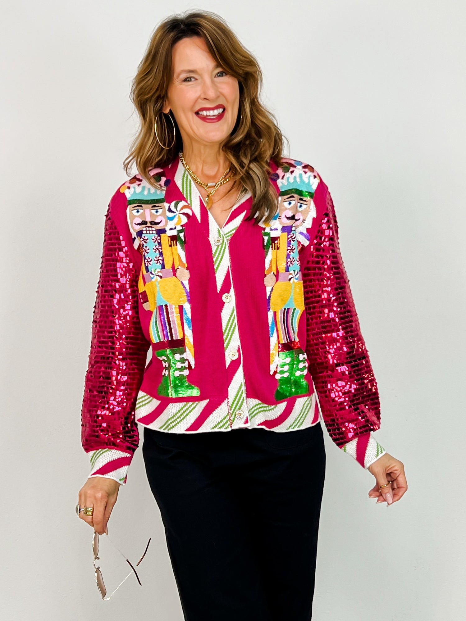 Turn heads and light up the room in this over-the-top festive fave from Queen of Sparkles! The Hot Pink Nutcracker Cardigan brings total holiday cheer with bright candy-colored sequin nutcrackers on the front and full sequin sleeves that shimmer with every move. Peppermint-striped trim adds the perfect playful finish, making this one a true showstopper for parties, parades, or sipping cocoa in style.
