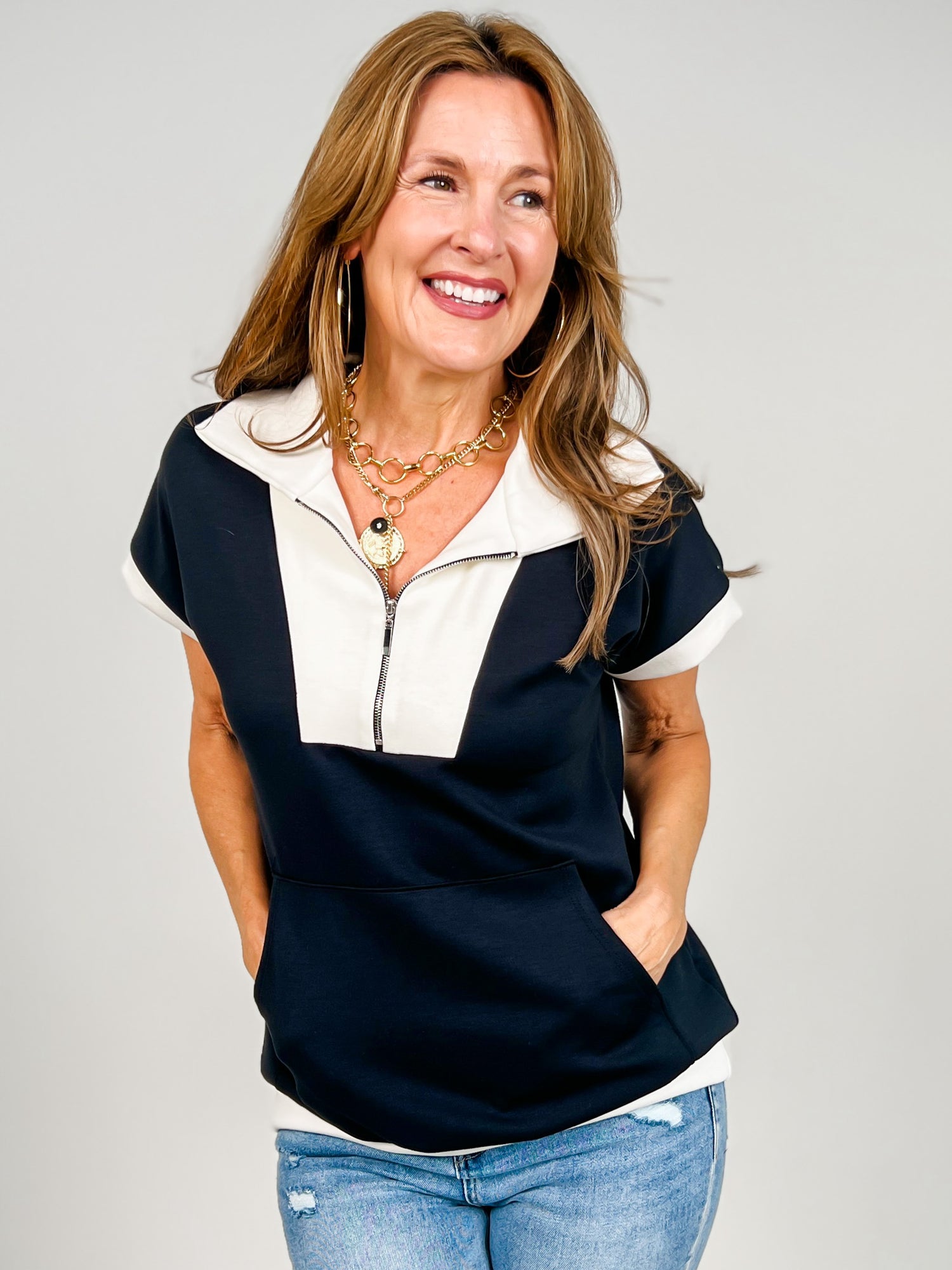 Effortless comfort meets everyday style with this short-sleeve modal zip-up top. The soft, breathable modal fabric drapes beautifully while keeping you cool throughout the day. Perfect for layering or wearing solo, the convenient zip front allows for easy adjustments to your comfort level. Whether you're running errands or relaxing at home, this versatile piece transitions seamlessly from casual to put-together. A wardrobe essential that feels as good as it looks.