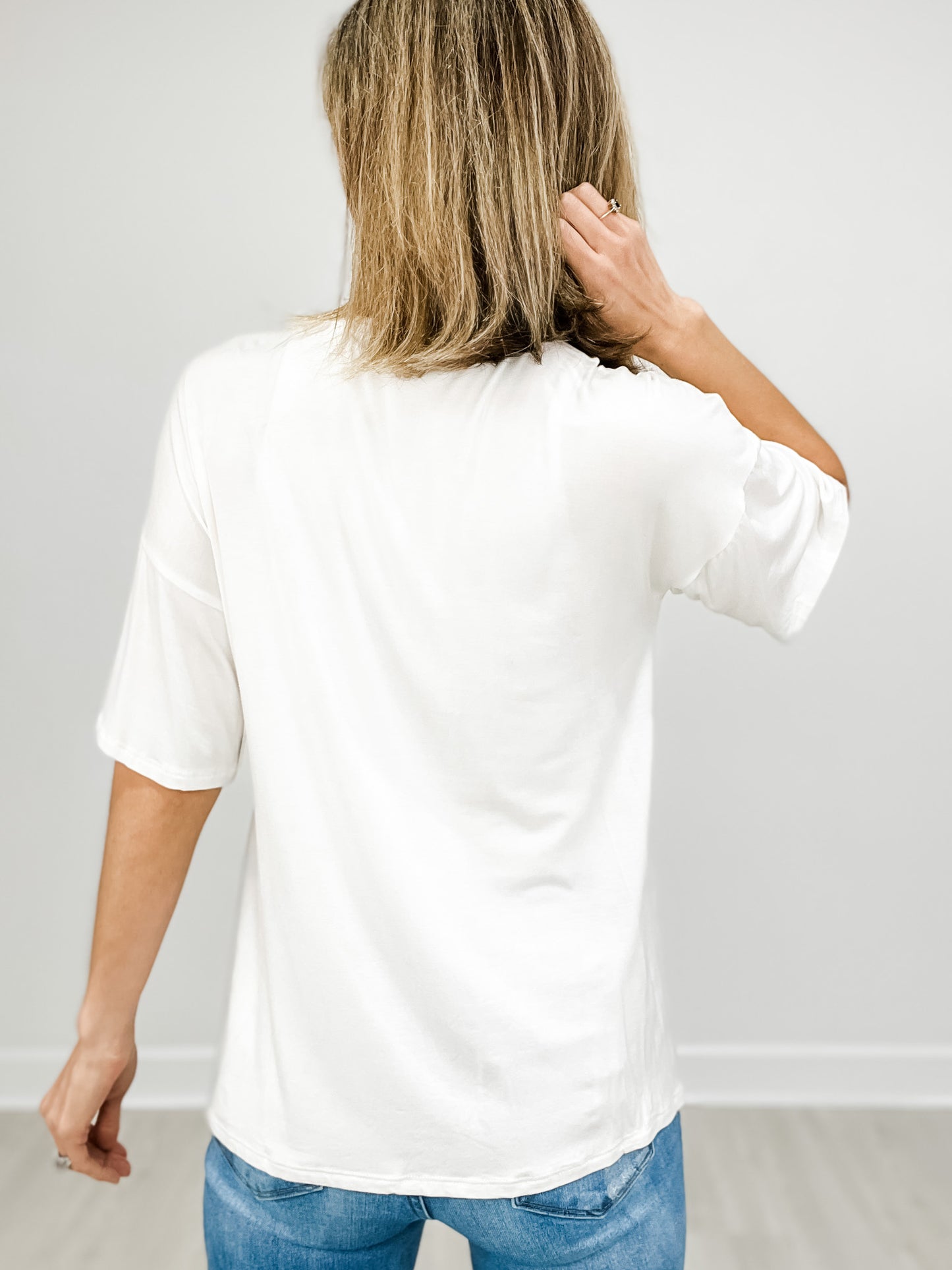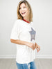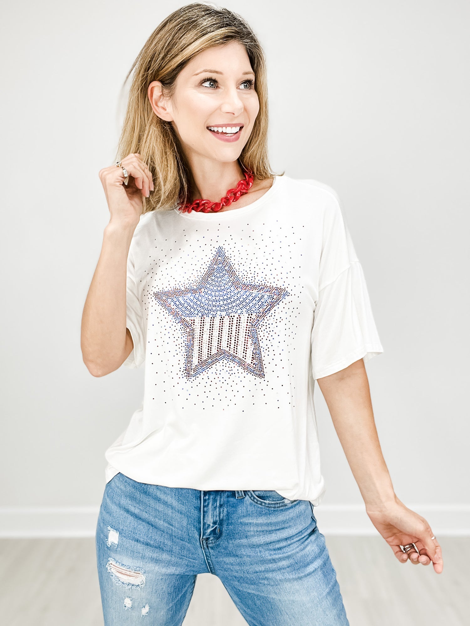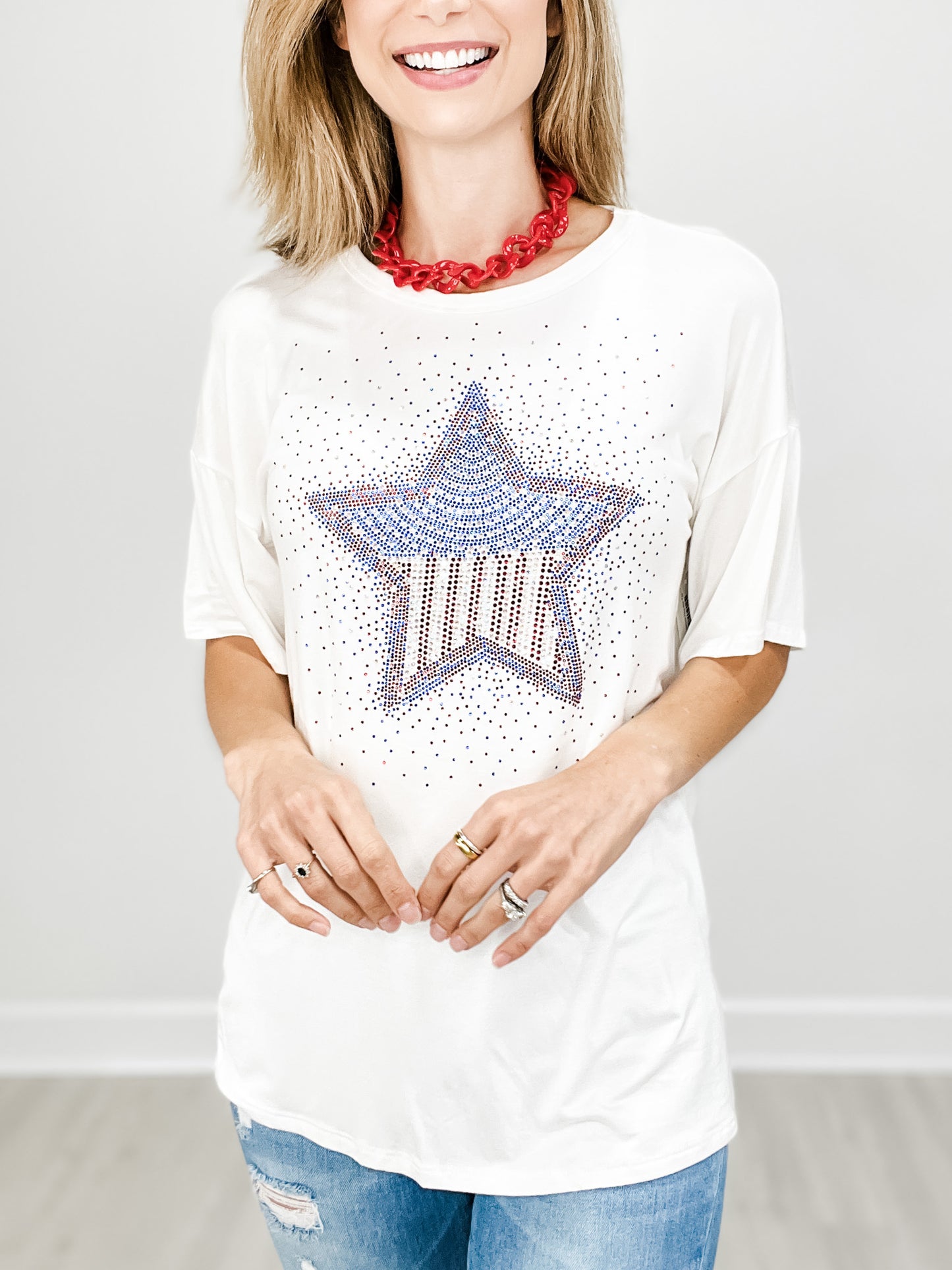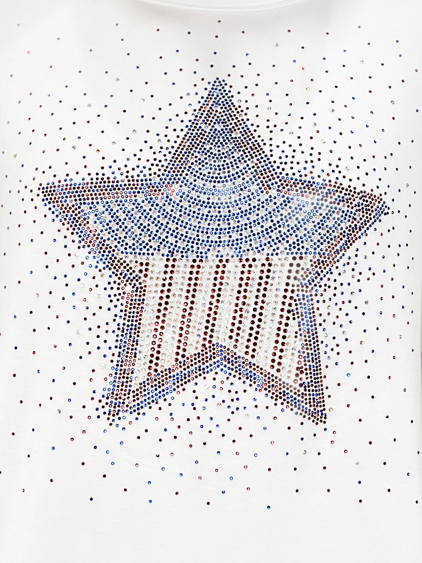 Show your patriotic side with our Short-Sleeved Rhinestone Flag Star Top. This stylish top features short sleeves and a bold flag star design embellished with rhinestones. It's perfect for showing off your love for your country in a fashionable way.