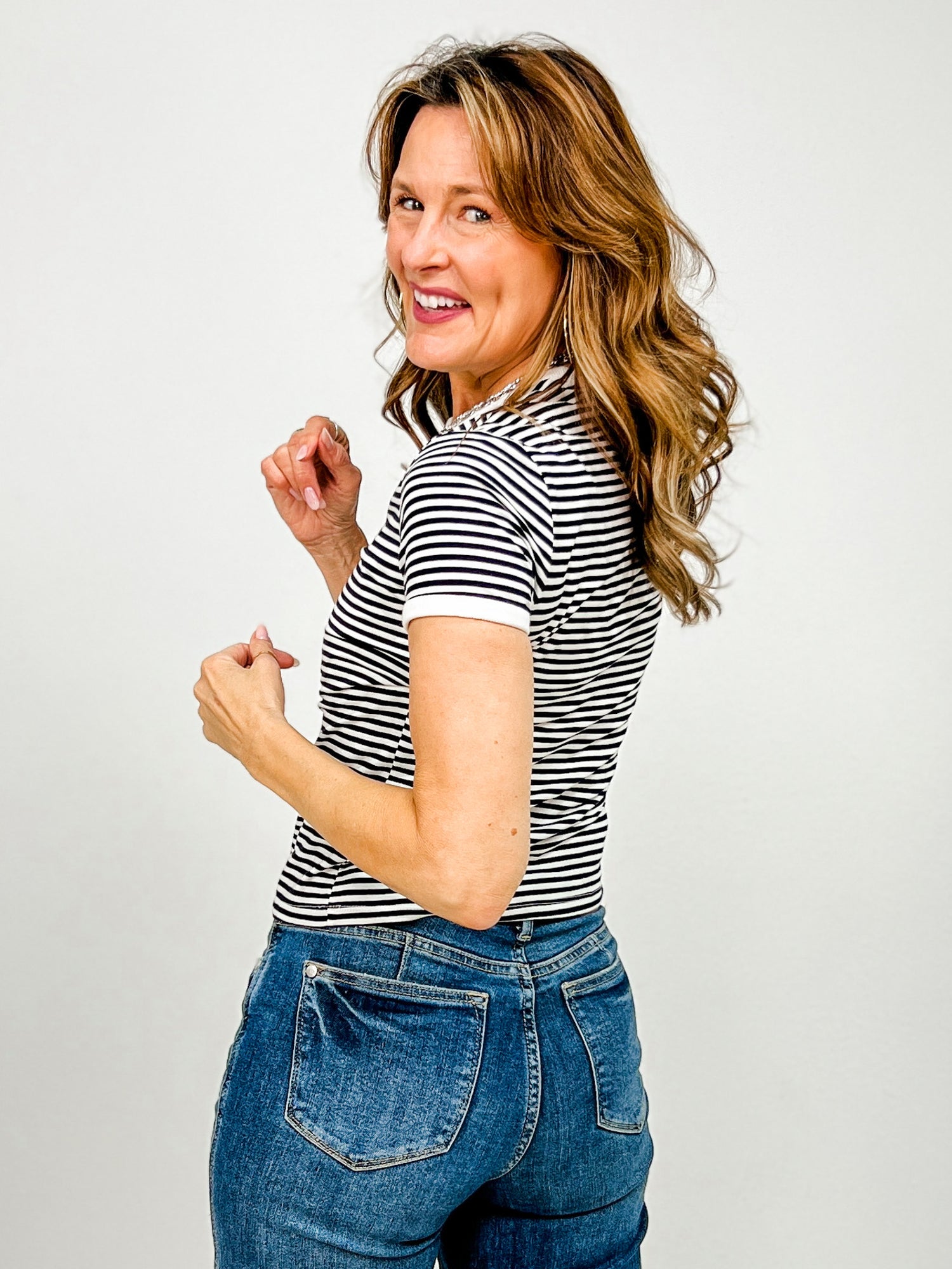 Stripes meet style in this breezy short-sleeve tee that's ready for anything. The crisp contrast trim adds a fun pop of personality to a timeless striped pattern, making it the perfect go-to for casual days and weekend adventures. Comfortable, versatile, and undeniably cute—this tee is about to become your new favorite.