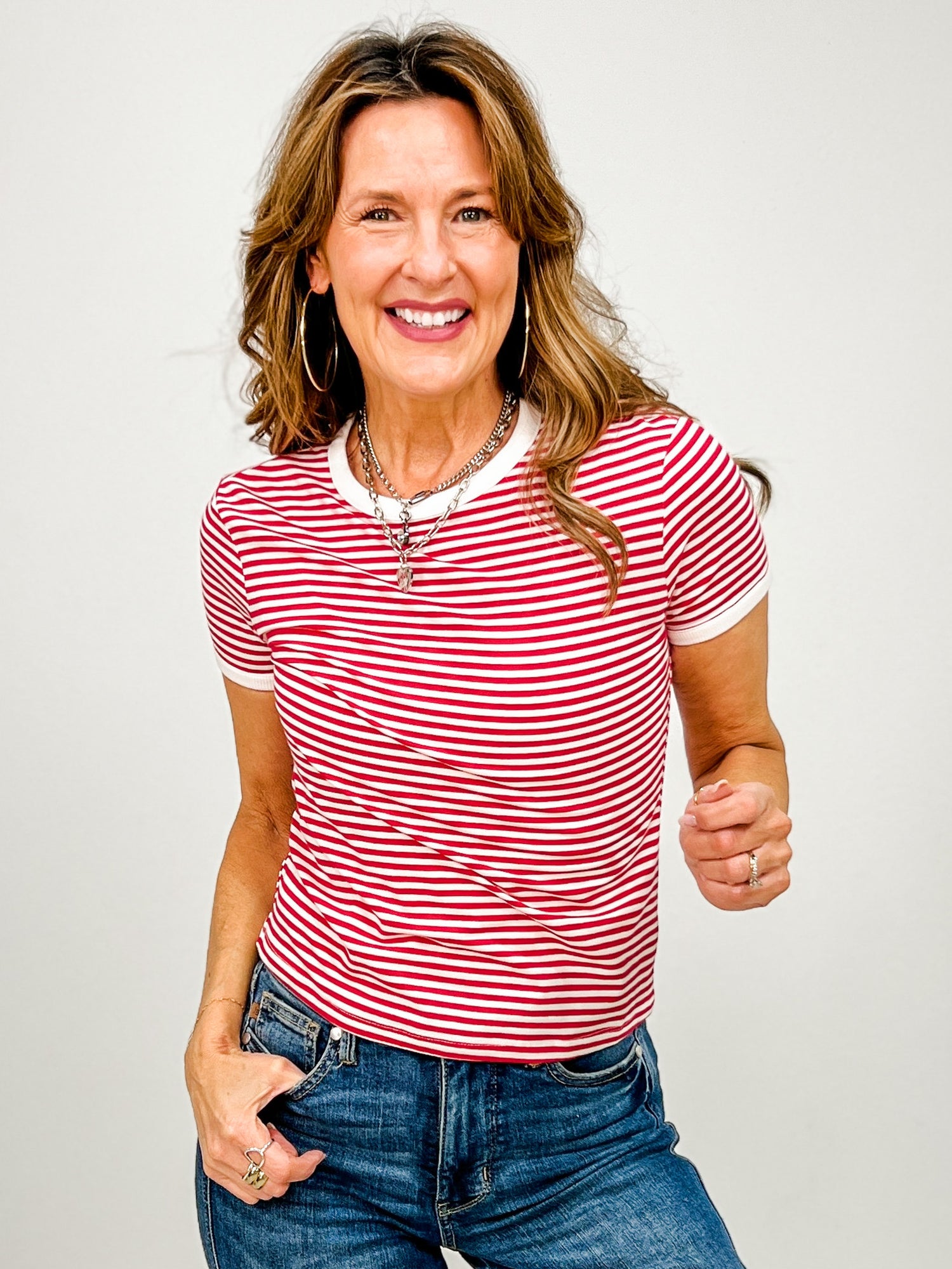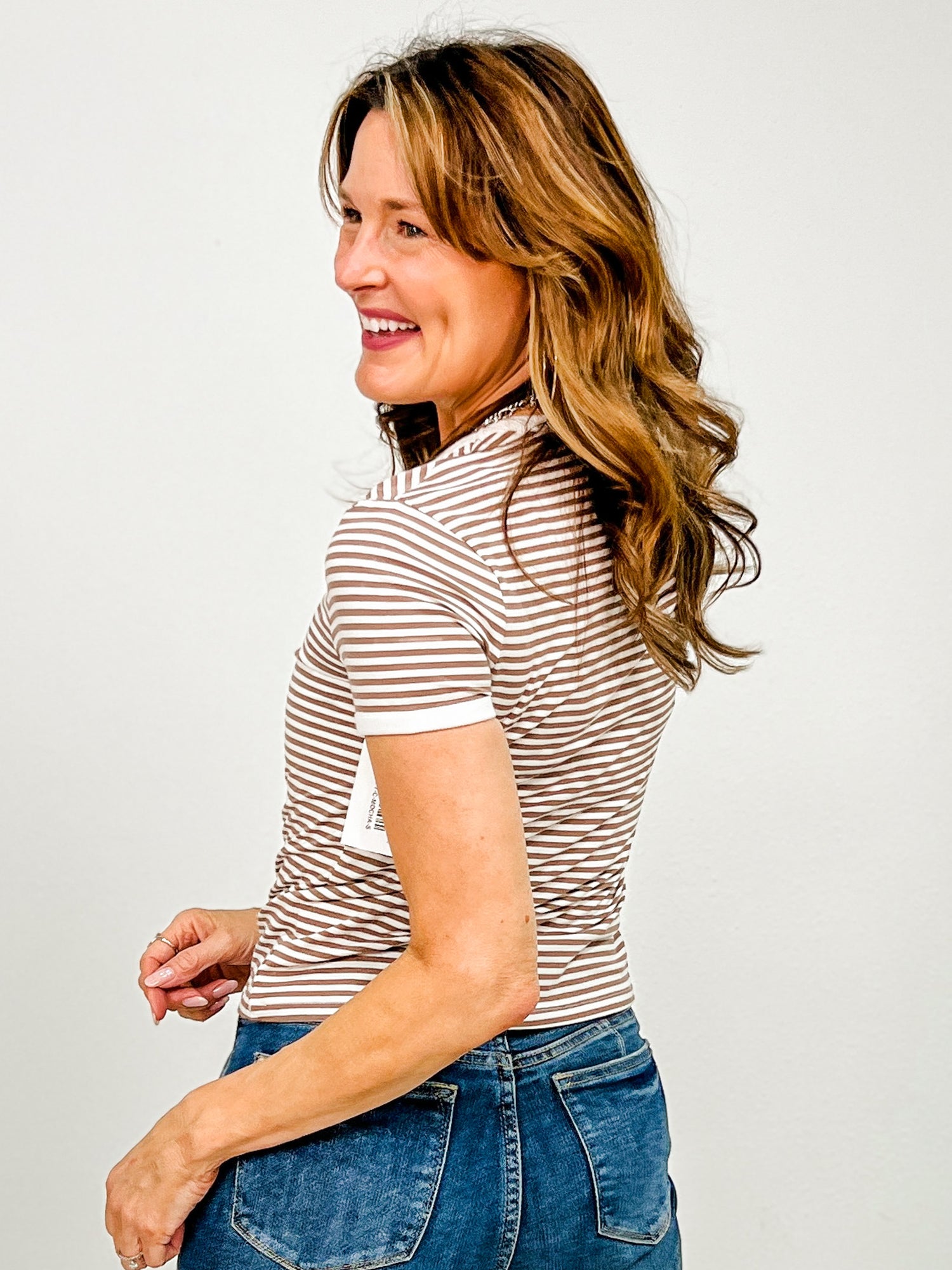 Stripes meet style in this breezy short-sleeve tee that's ready for anything. The crisp contrast trim adds a fun pop of personality to a timeless striped pattern, making it the perfect go-to for casual days and weekend adventures. Comfortable, versatile, and undeniably cute—this tee is about to become your new favorite.