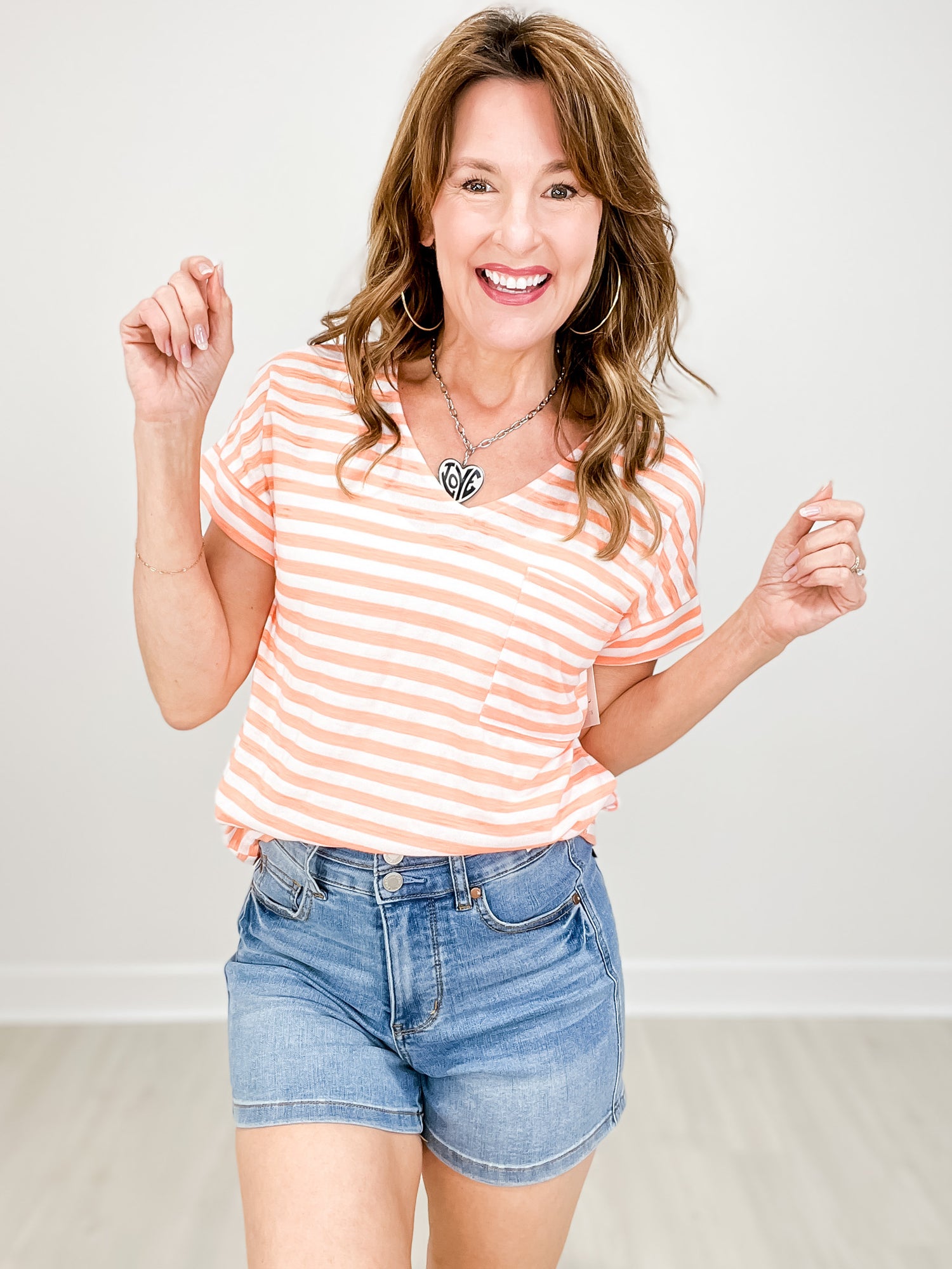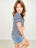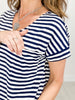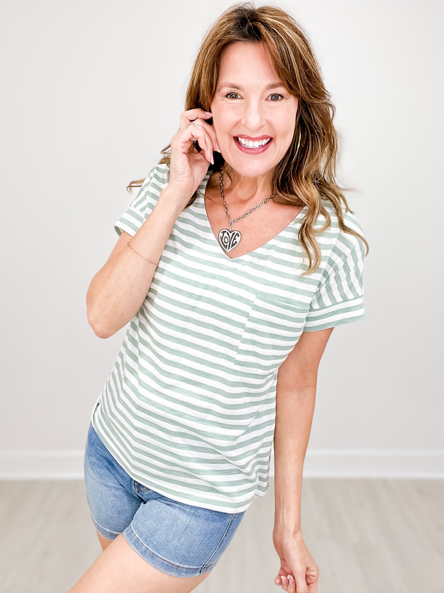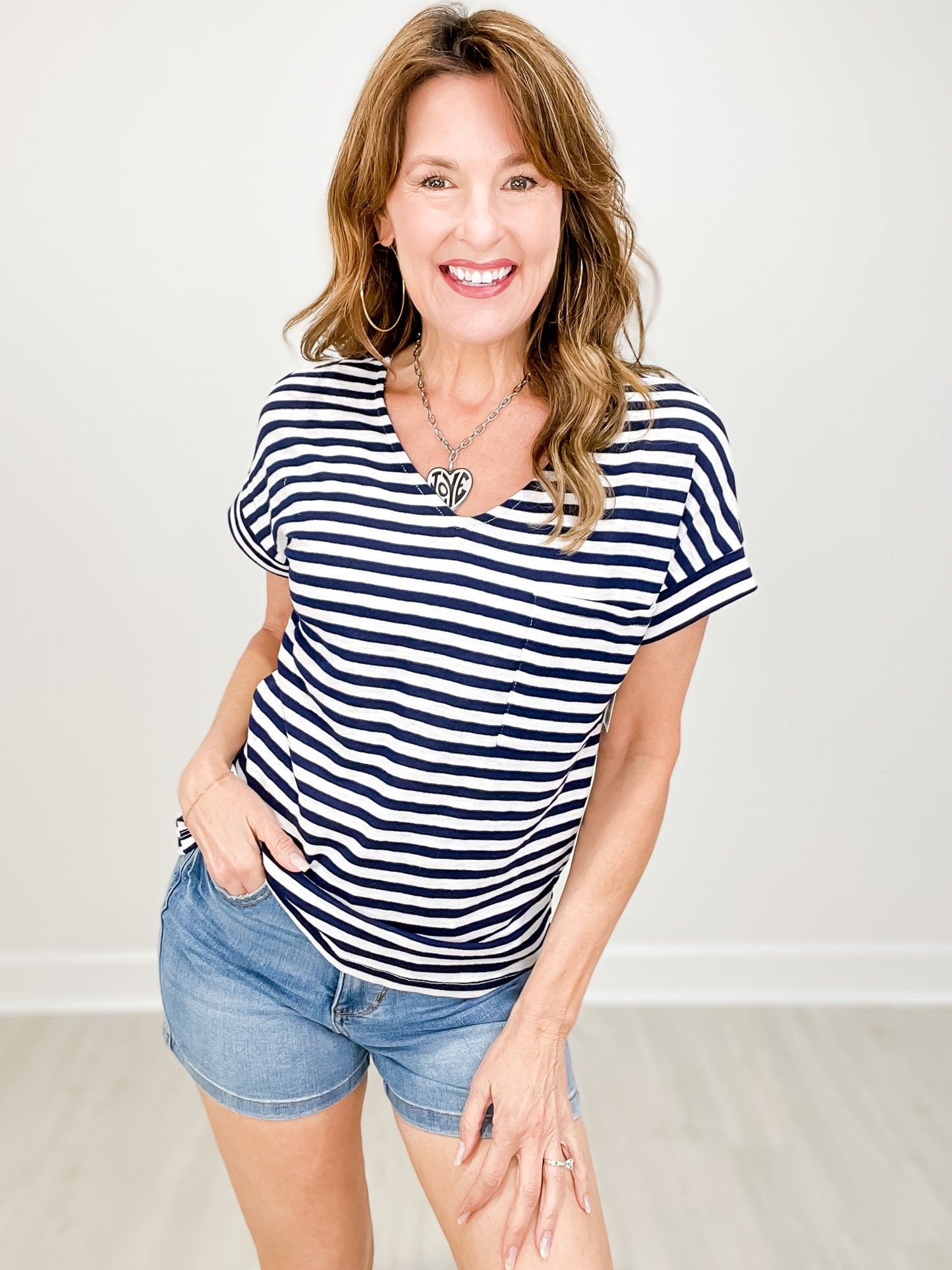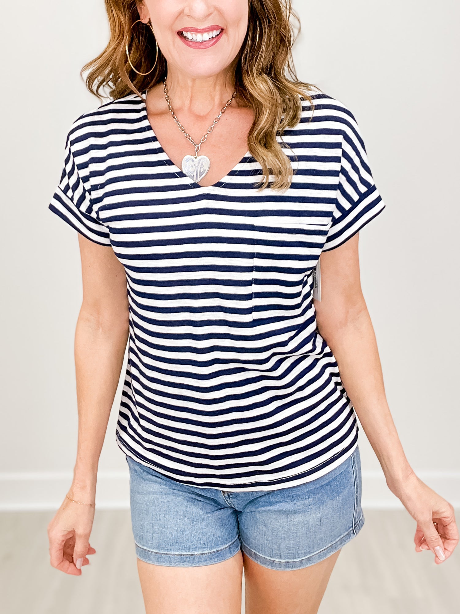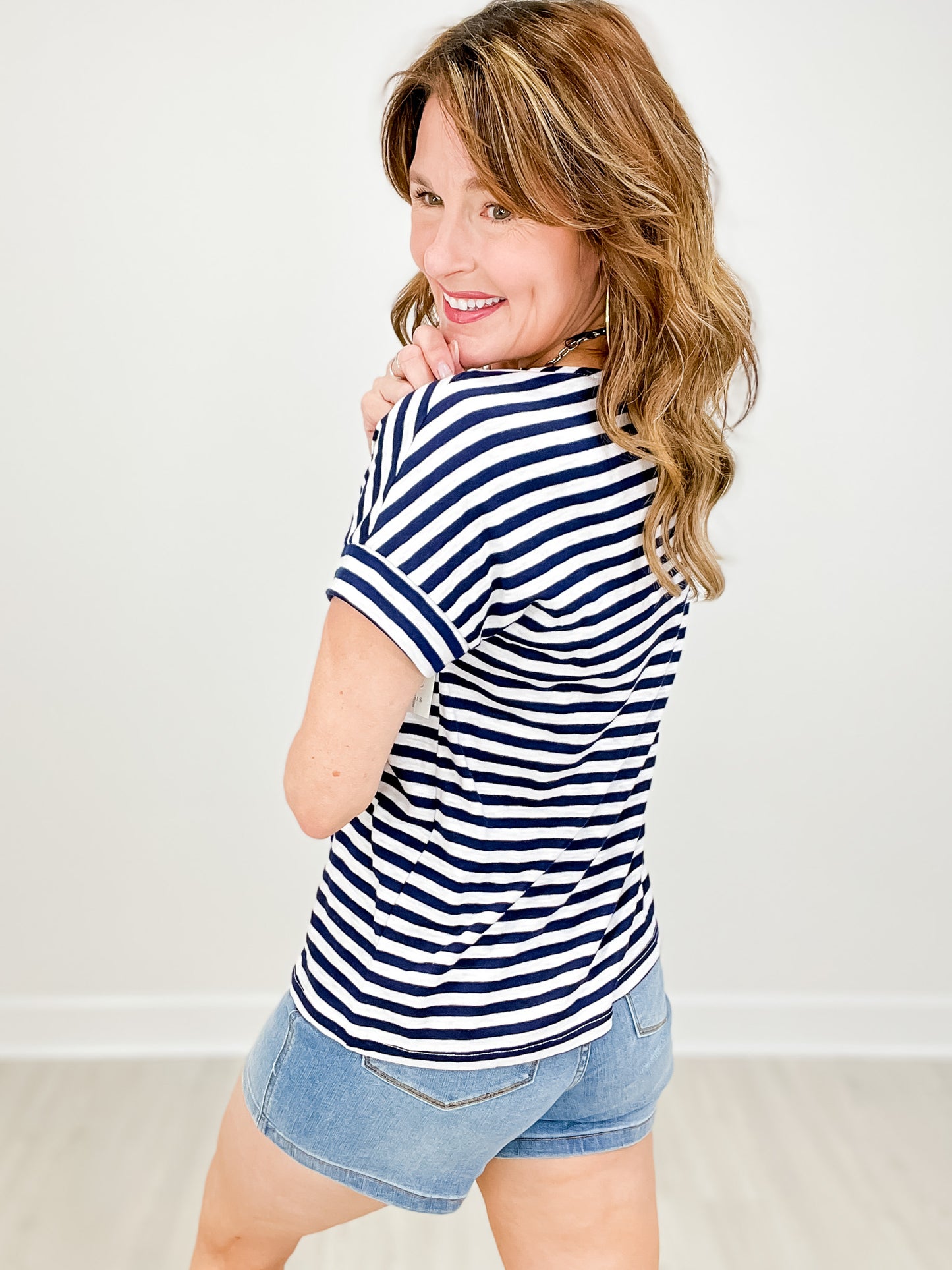 Short Sleeve Striped Slub Knit Top with Chest Pocket