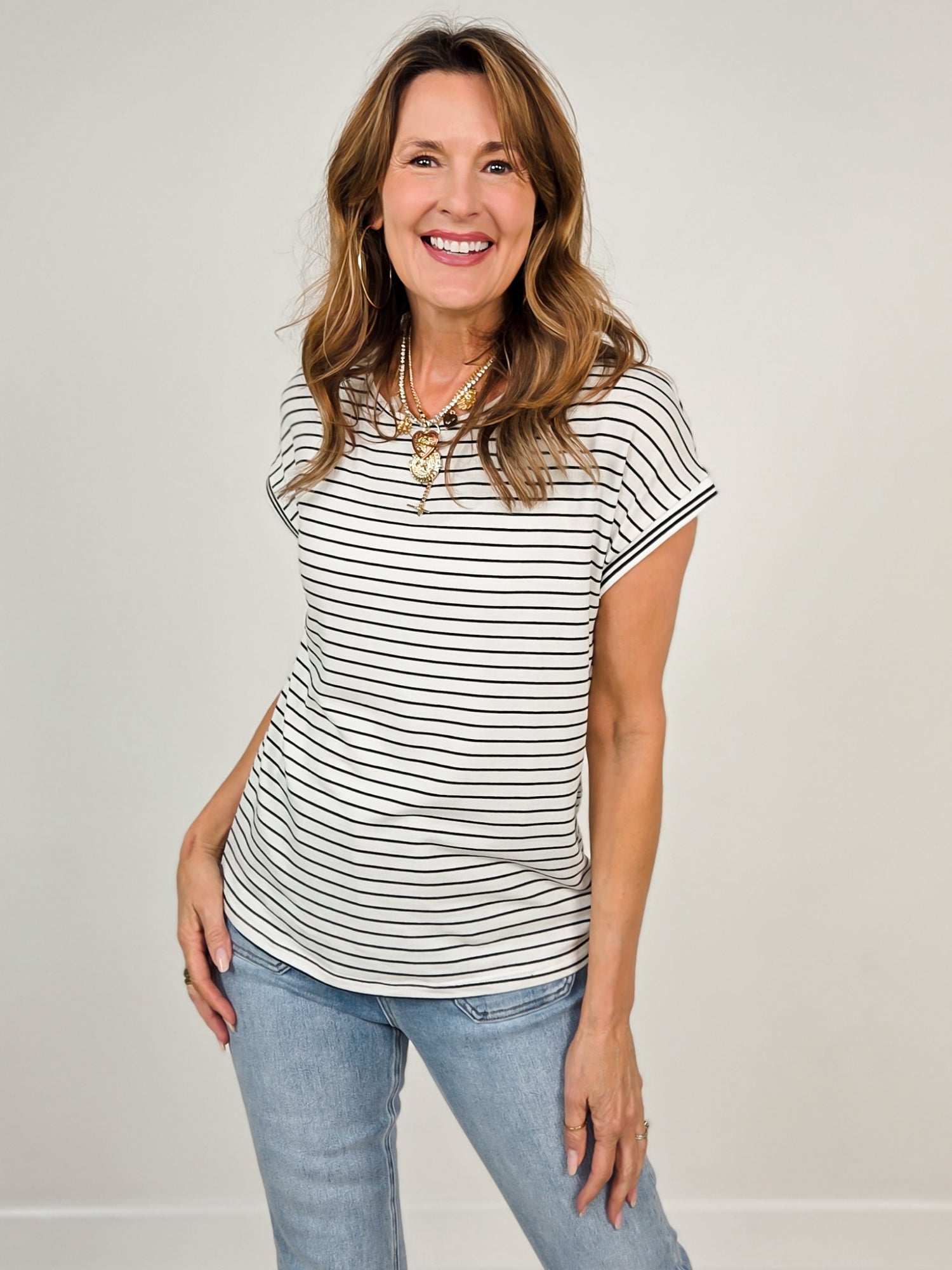 Stripes meet sporty style in this short-sleeve varsity top! Featuring a classic striped pattern and reinforced taped hem for lasting durability, it's the perfect layering piece for casual days. The relaxed fit keeps things comfortable while the varsity-inspired design adds instant character to any outfit. Throw it on with jeans, shorts, or your favorite bottoms for effortless, fun-loving vibes.