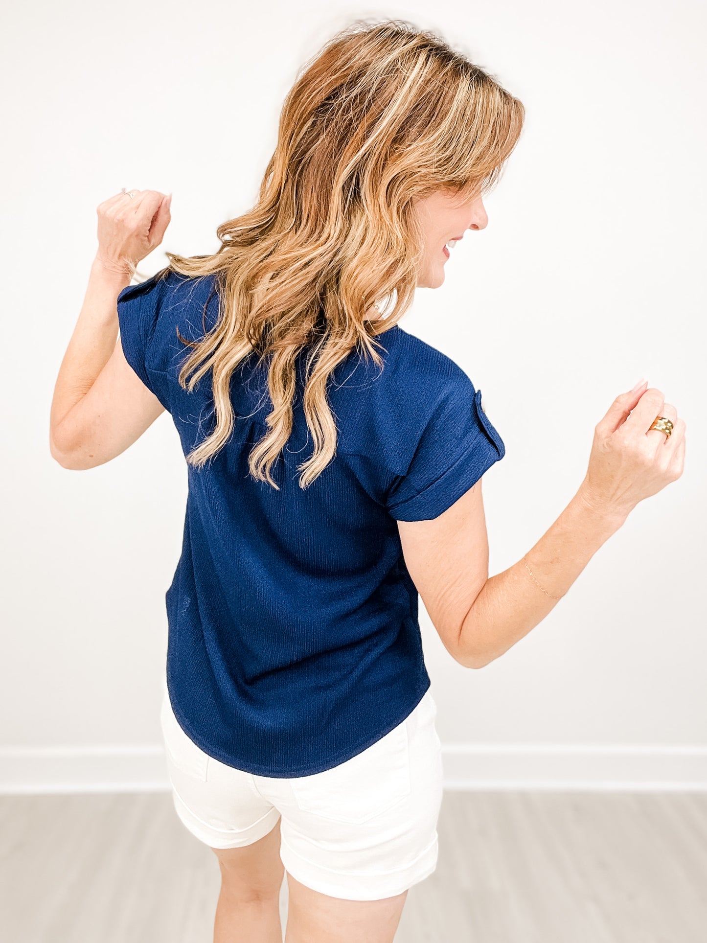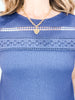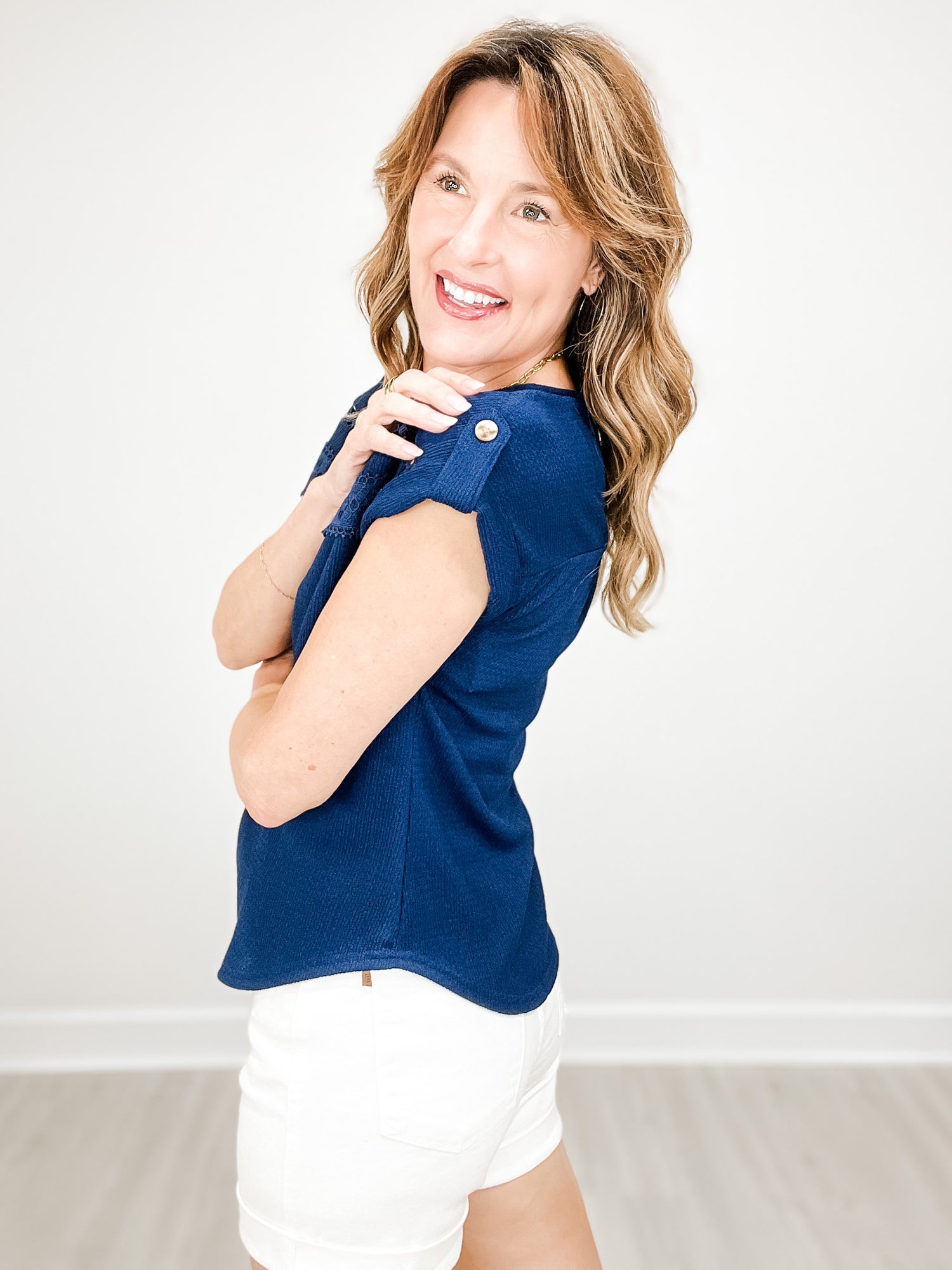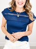 This top effortlessly combines style and comfort with its lace trim detailing and crinkle knit material. Perfect for any occasion, the short tab sleeves add a touch of sophistication while providing versatility for all-day wear. Upgrade your wardrobe with this must-have piece.