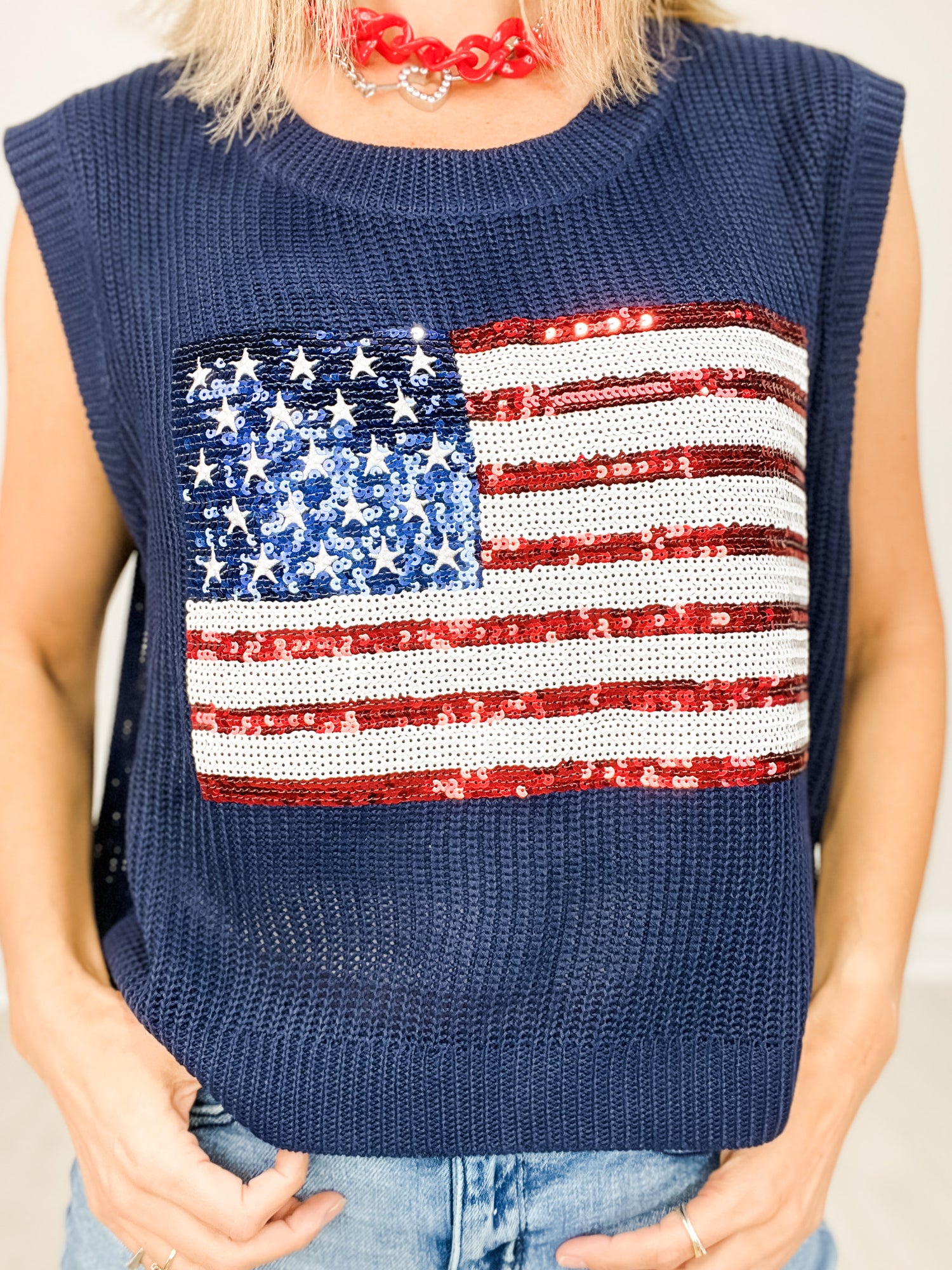 [message]Show off your patriotism with this stylish Sleeveless Knit Top featuring a sequin American Flag design. Perfect for any occasion, this top is comfortable and eye-catching. Stand out in style with this must-have addition to your wardrobe.