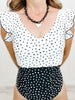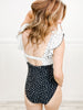 A sleeveless polka dot knit swimsuit with a V-neck featuring ruffle sleeves and a back strap. Fabric is a lightweight performance knit.