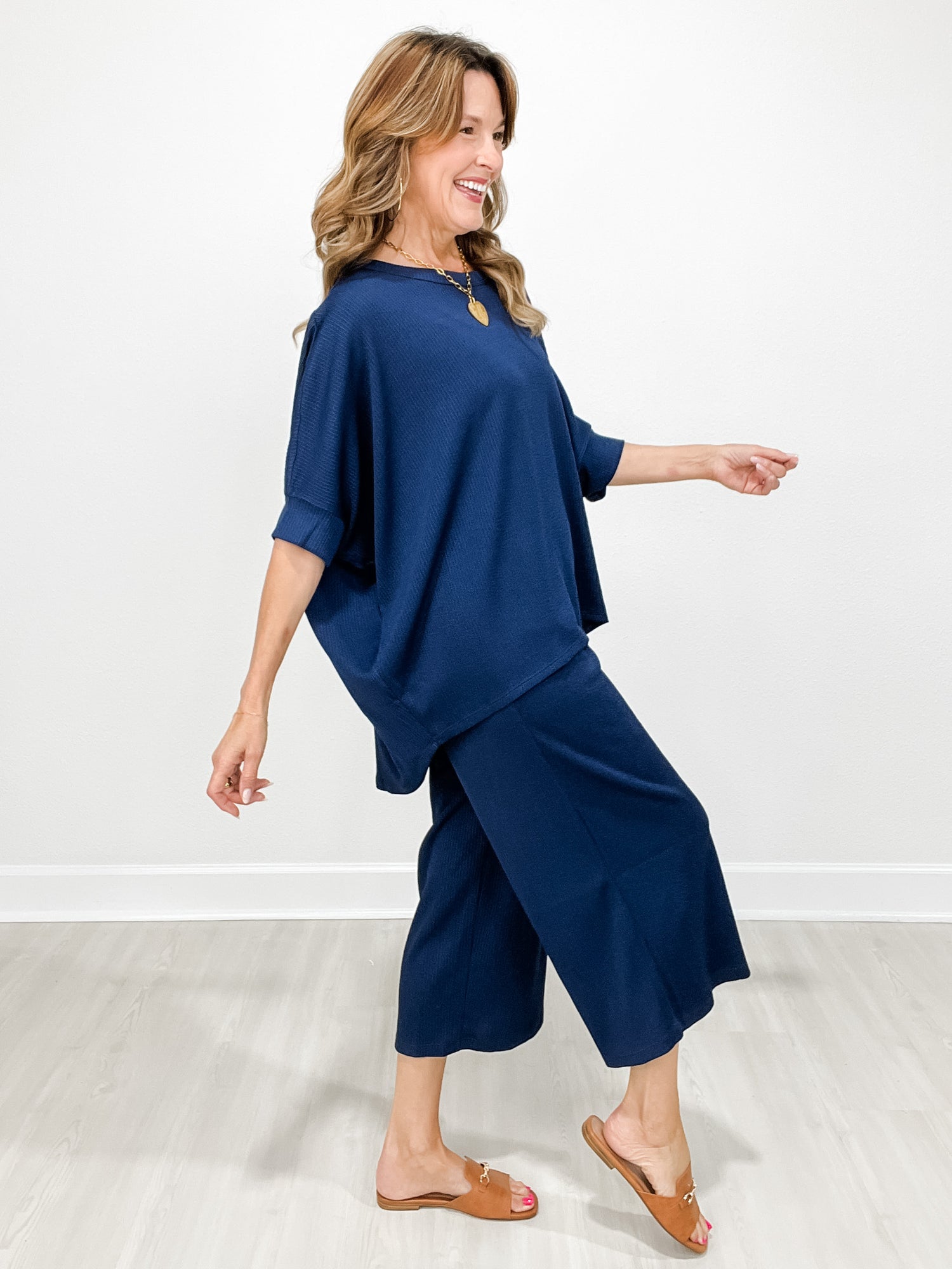 Solid Jacquard Loose Fit Top with Wide Leg Pants Set in Navy