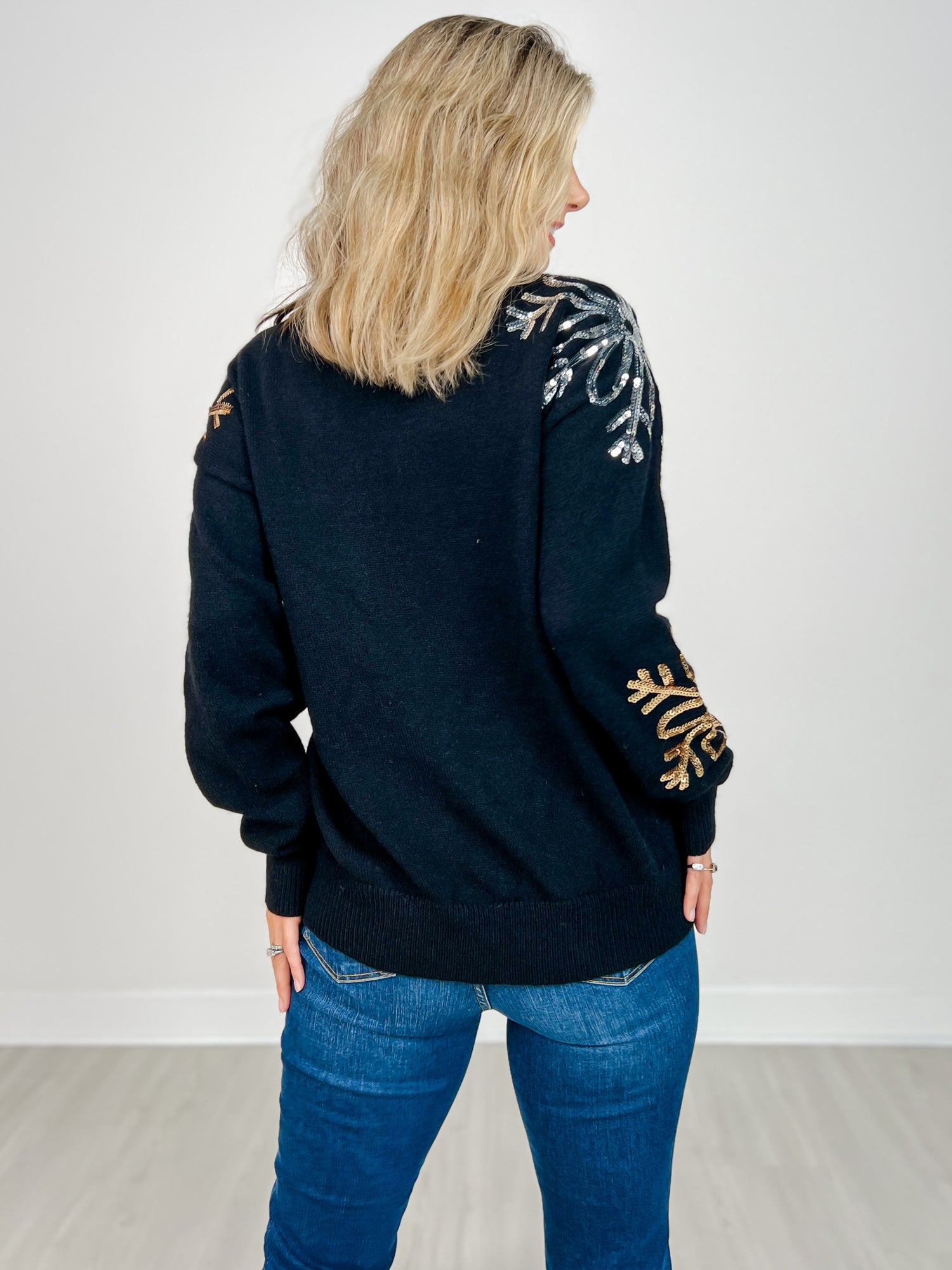 Solid Knit Sweater with Sequin Snowflakes