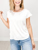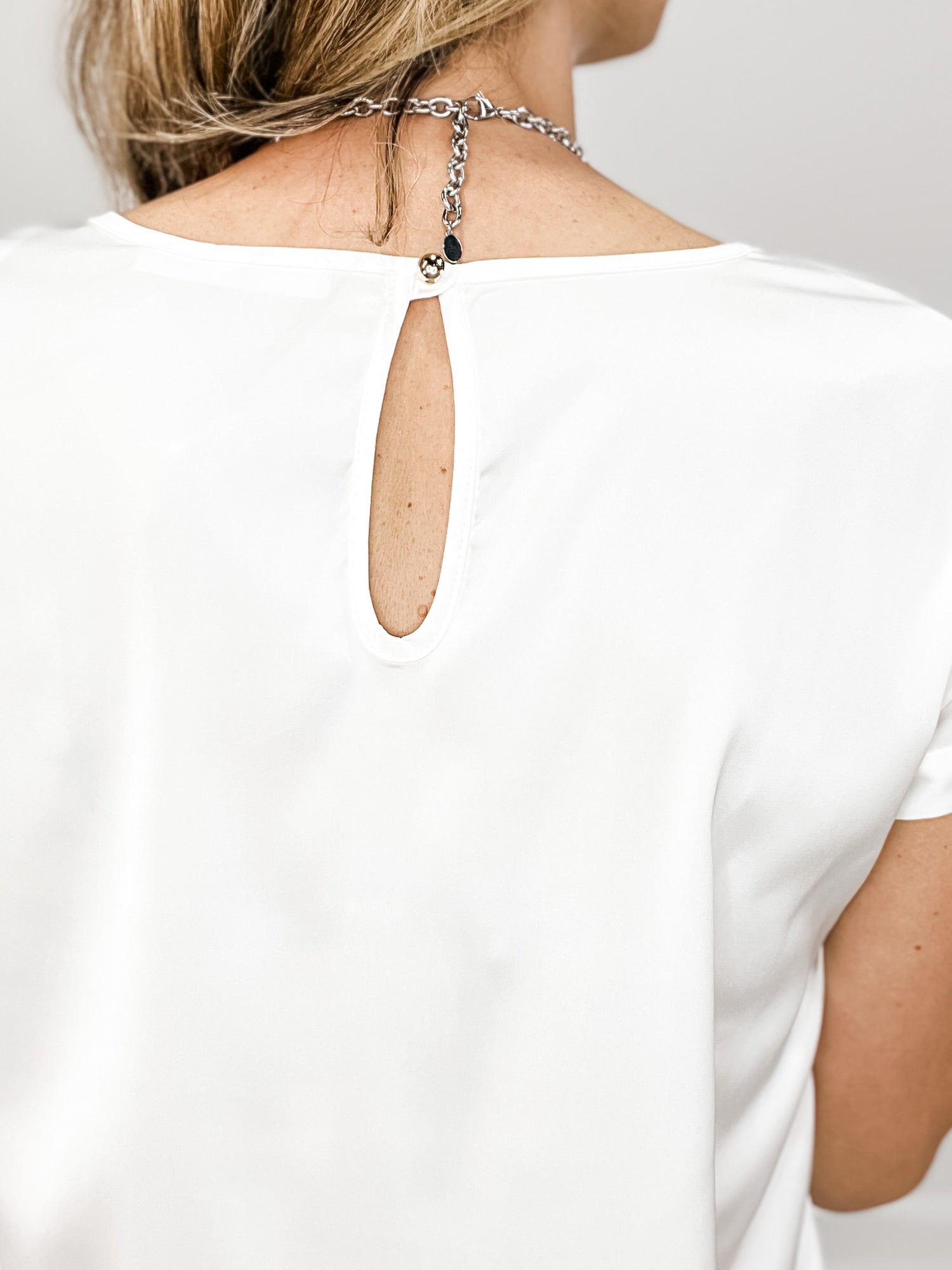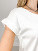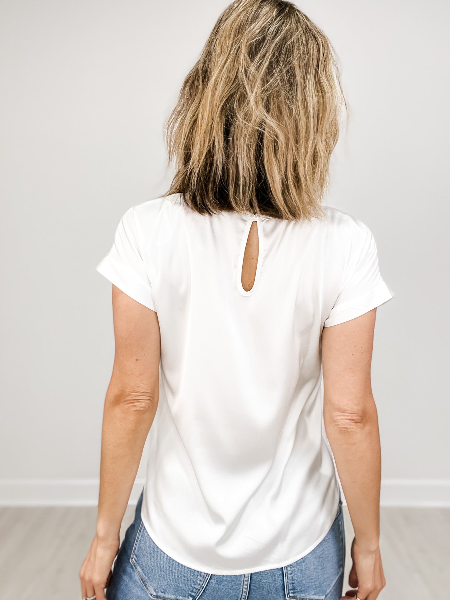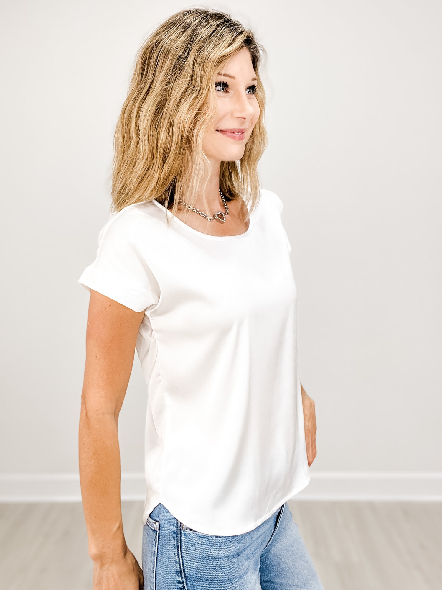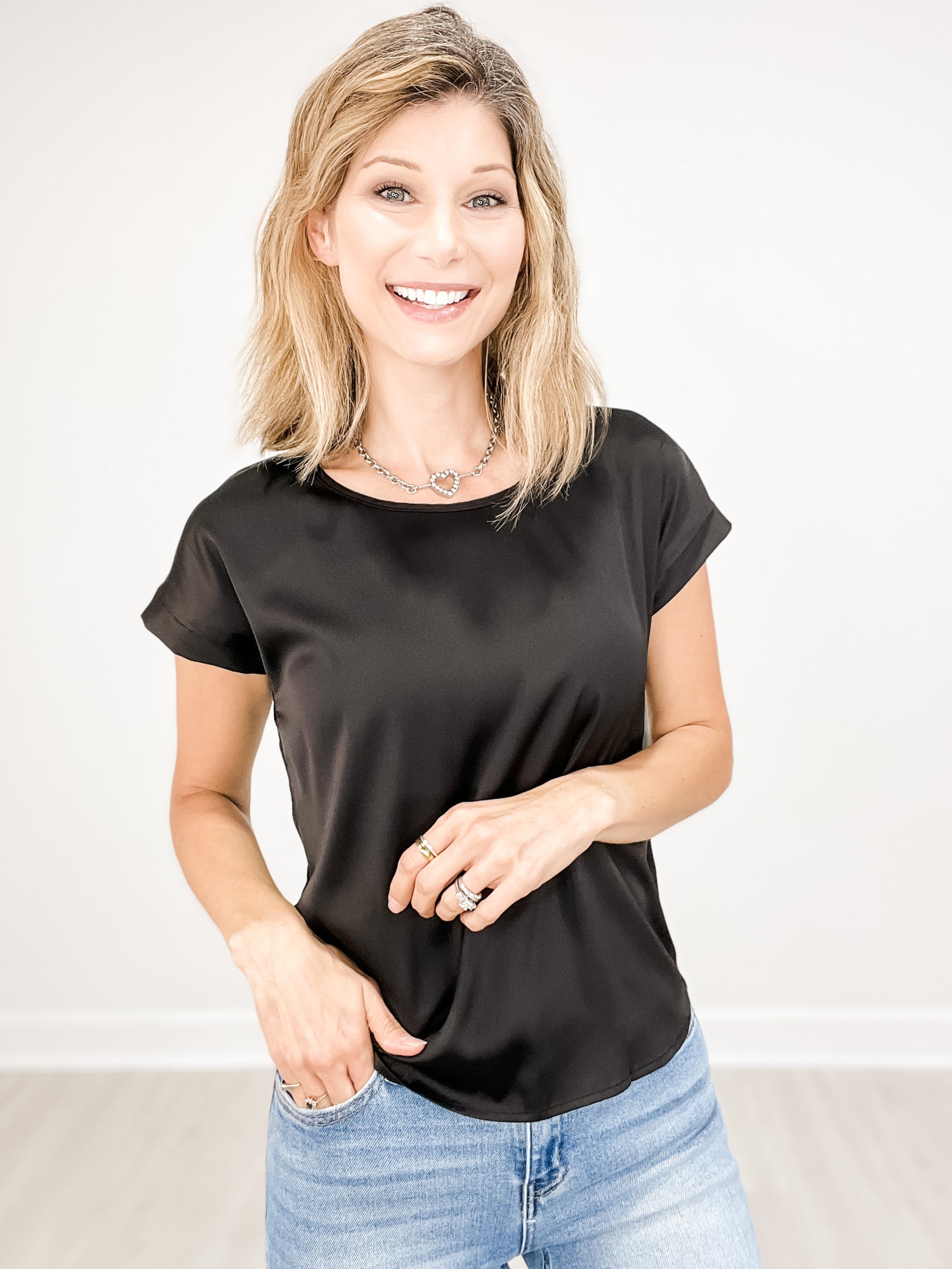 This stretch satin short sleeve top features a round neckline, making it comfortable and stylish. The lightweight fabric allows for easy movement, while the versatile design makes it perfect for any occasion. Upgrade your wardrobe with this must-have top and feel confident and chic all day long.