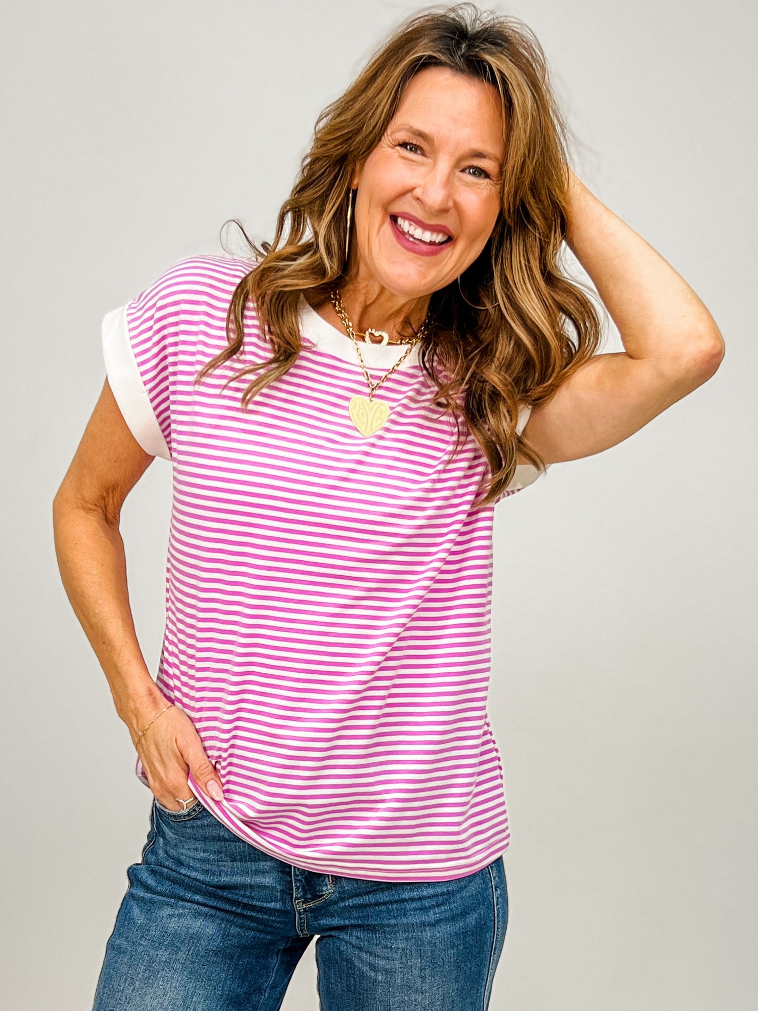 Elevate your everyday wardrobe with this charming striped top featuring a playful contrast trim that frames the classic round neckline perfectly. The crisp stripes add visual interest while the coordinating trim detail brings a polished, put-together vibe to any outfit. Whether you're dressing it up for brunch or keeping it casual with your favorite jeans, this versatile piece delivers effortless style with a fun twist. A wardrobe essential that works as hard as you do!
