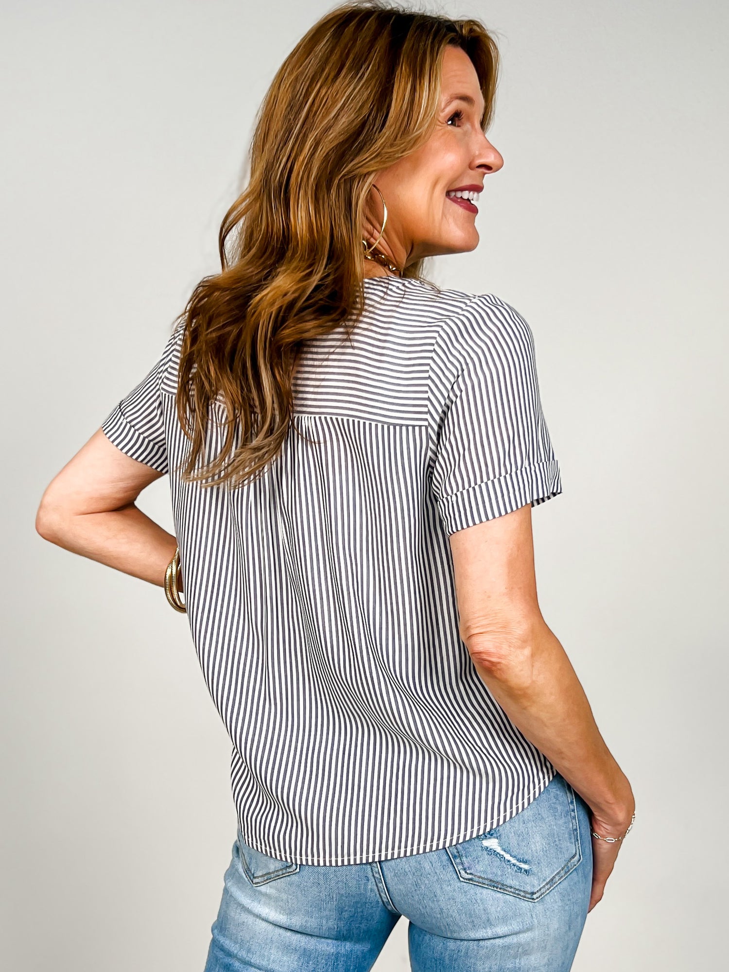 Effortless style meets everyday comfort in this striped button-down top. The split neckline adds a modern twist to a classic silhouette, while short sleeves keep you cool and collected. Versatile enough for casual outings or layered under jackets for a polished look. Perfect for building a wardrobe of timeless pieces that work season after season.