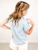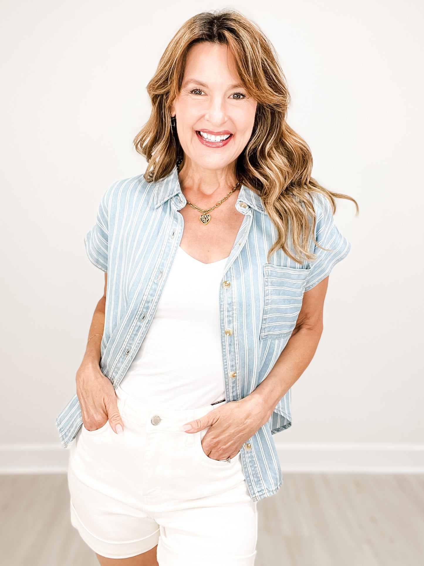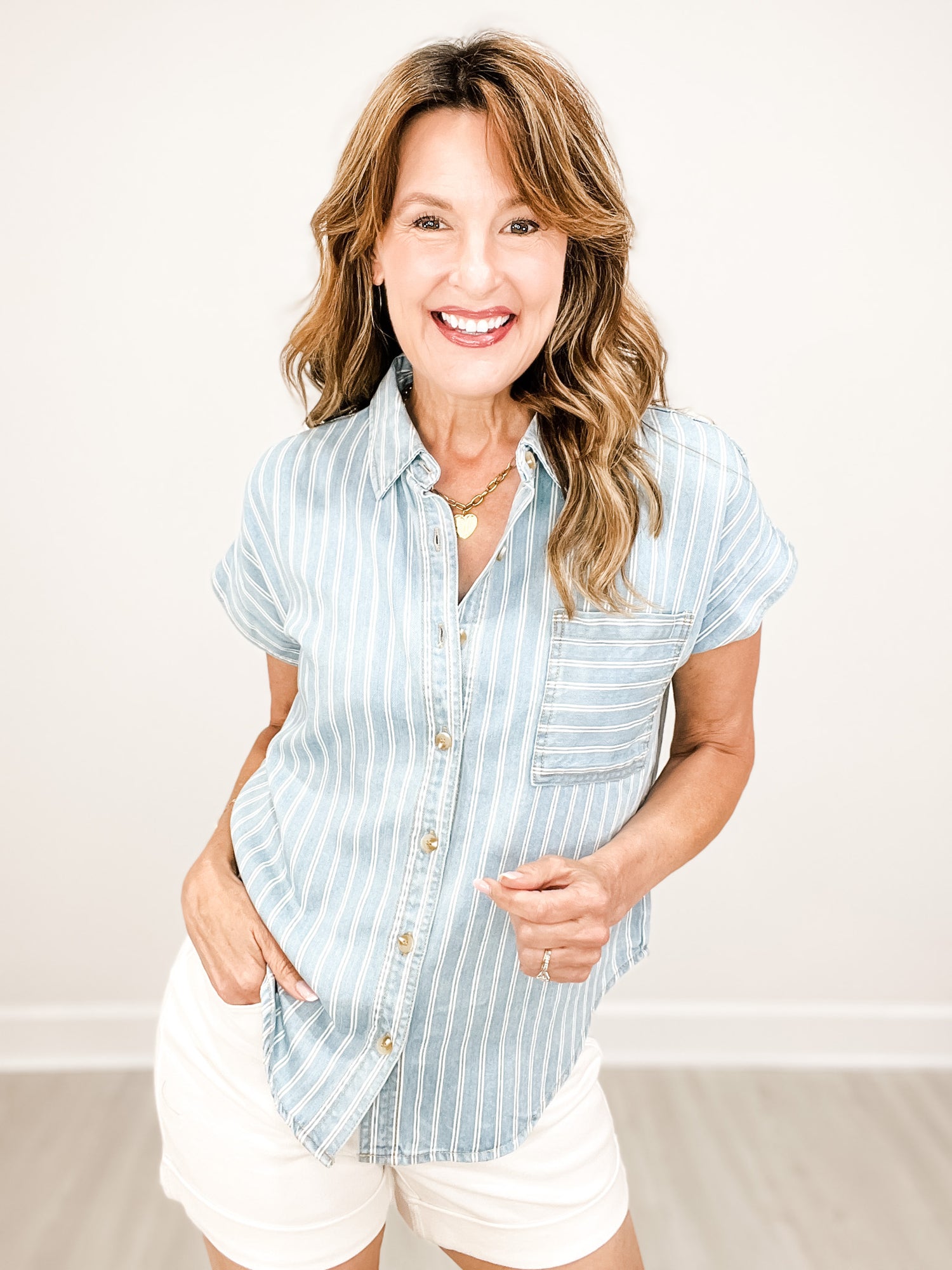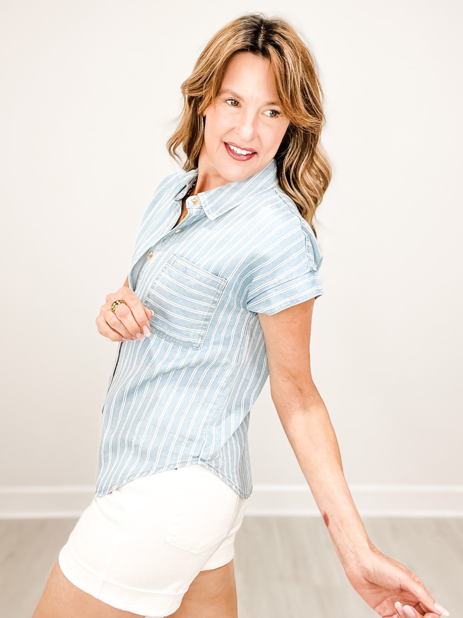Striped Chambray Short Sleeve Button-Down Collared Top