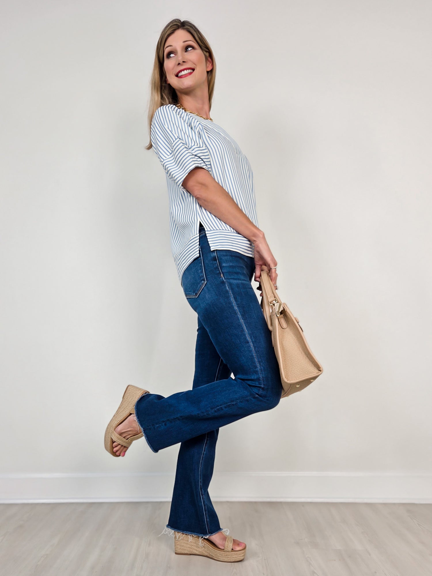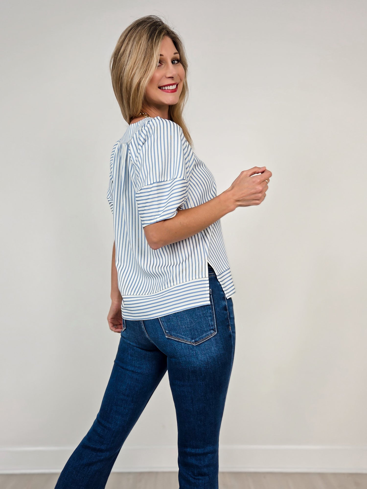 Stripes never go out of style—and this breezy V-neck top proves it! Perfect for layering or wearing solo, the short sleeves keep things cool while the flattering neckline adds just the right touch of polish. Whether you're heading to brunch or running errands, this versatile striped essential pairs with everything in your closet. Comfortable, chic, and endlessly wearable.