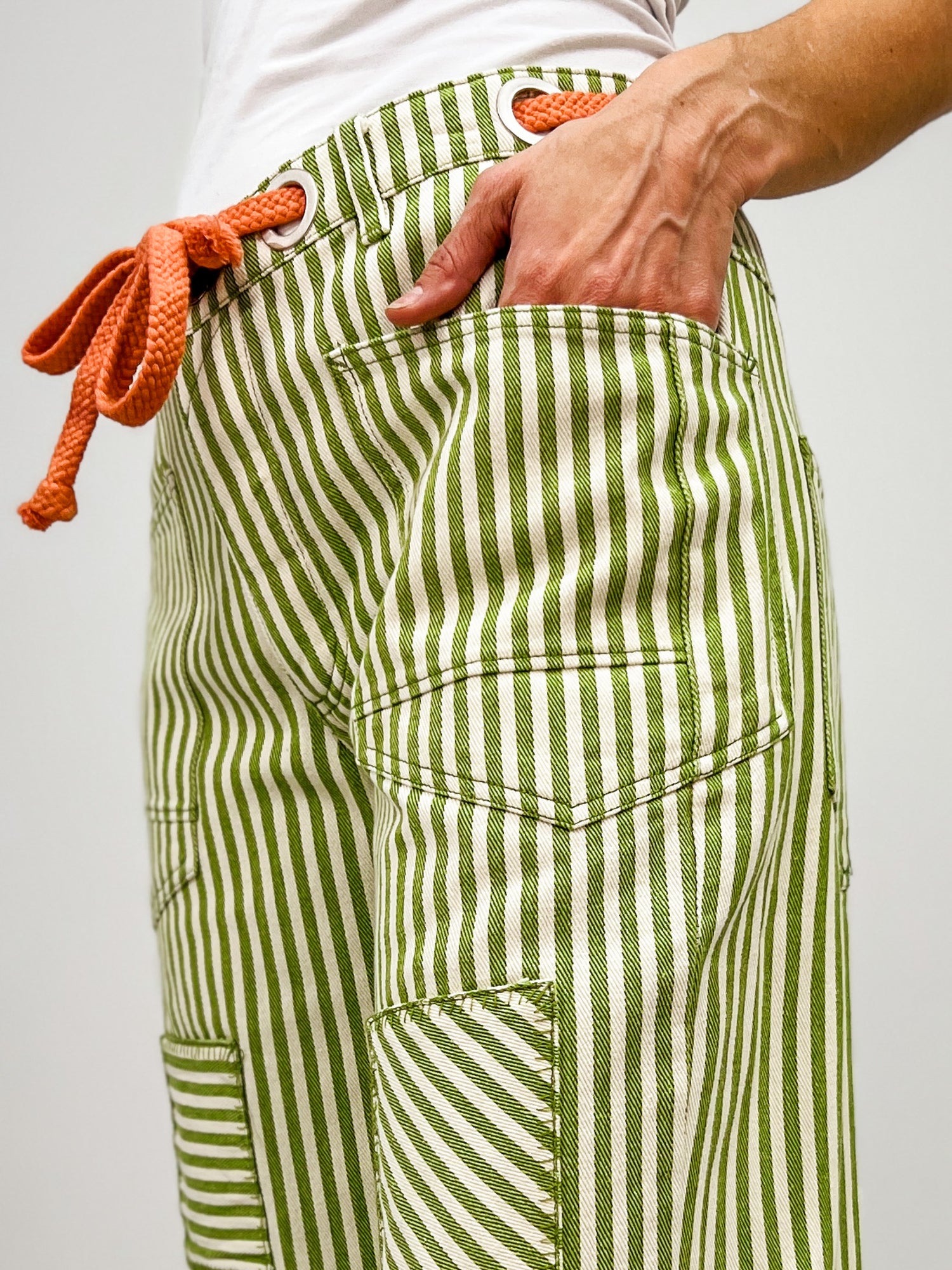 Striped Twill Barrel Pants with Drawstring Waist in Lime