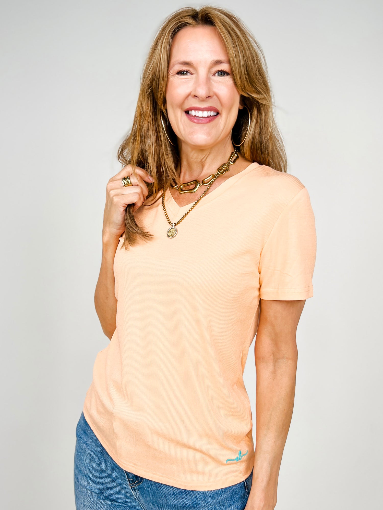 Meet your new everyday favorite — The Lucy Short Sleeve V-Neck Tee. Made from a luxe 92% viscose, 8% spandex blend, this tee is unbelievably soft with the perfect amount of stretch. It has that smooth, buttery feel customers fall in love with, while offering a flattering, gently fitted silhouette.