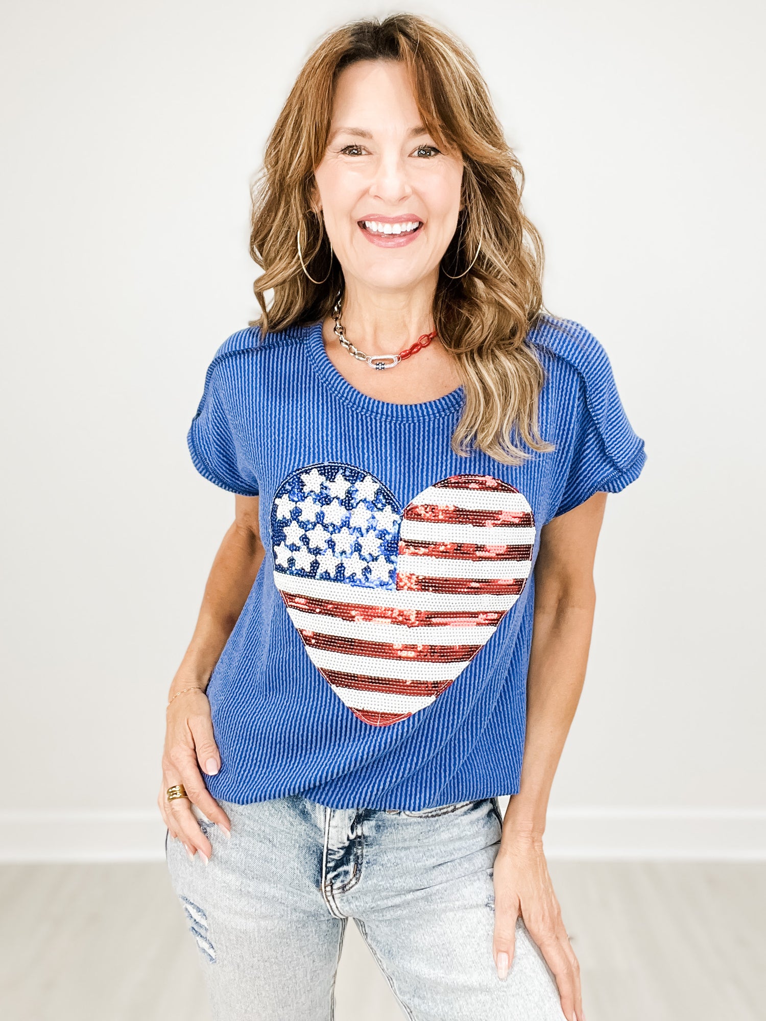 Urban Ribbed Short Sleeve Top with American Flag Heart Sequins Patch