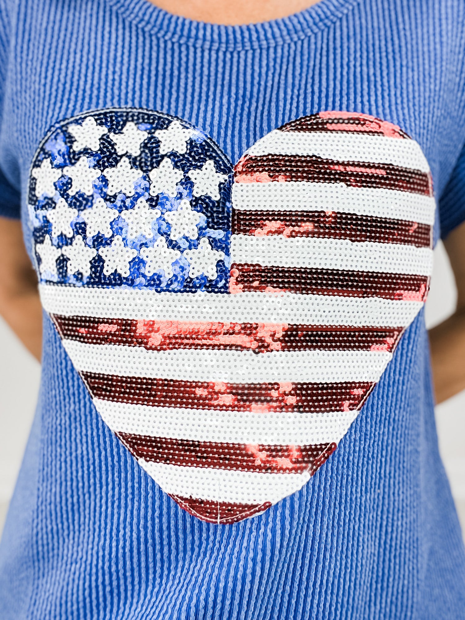 Celebrate your love for the USA with our Urban Ribbed Short Sleeve Top. The American Flag Heart Sequins Patch adds a touch of patriotism to this stylish top. Made with ribbed fabric, it offers a comfortable and flattering fit. Perfect for any casual occasion.
