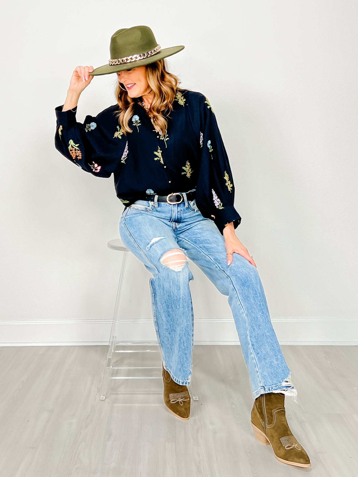 V-Neck Embroidered Botanical Long Sleeve Top