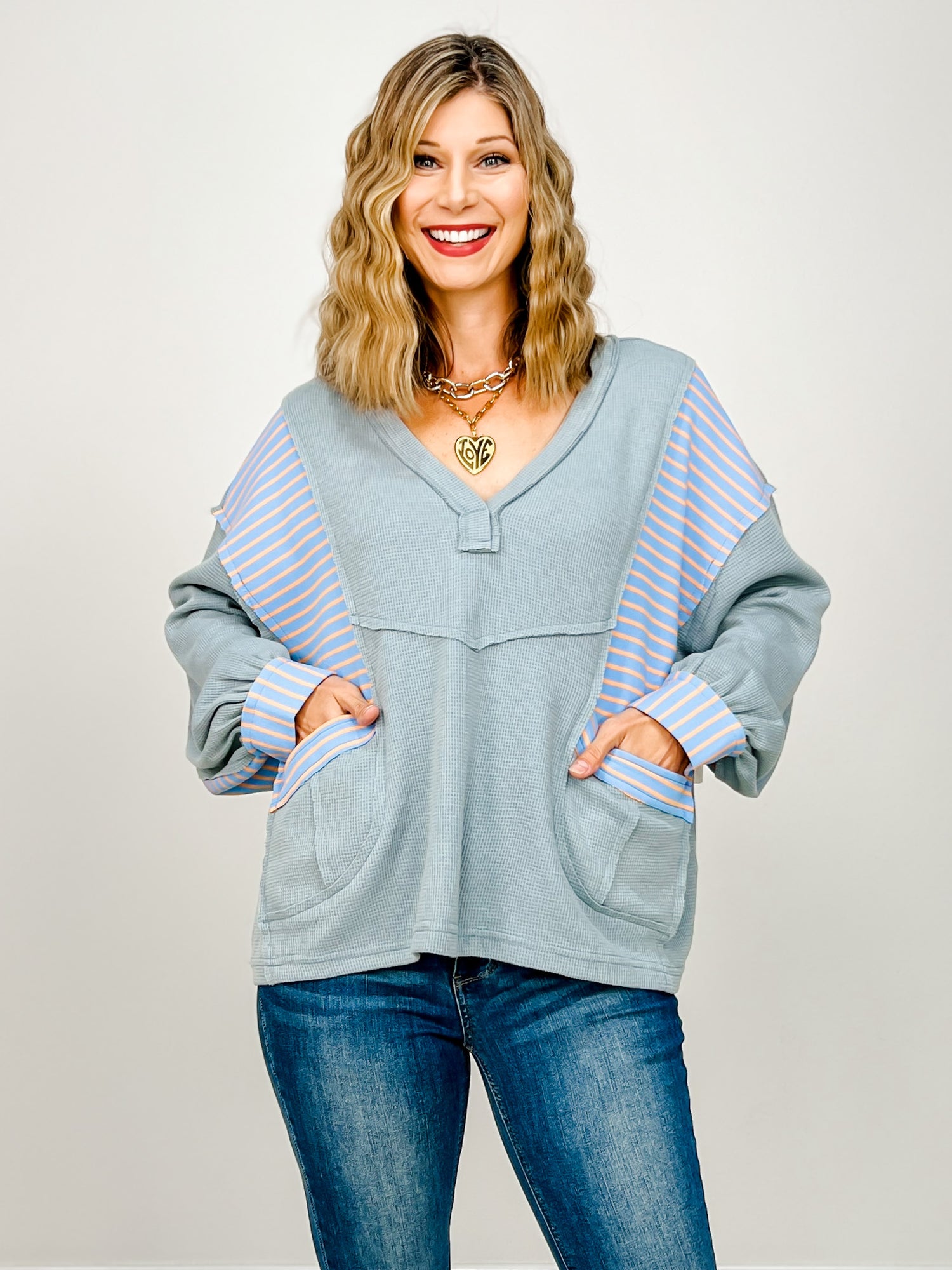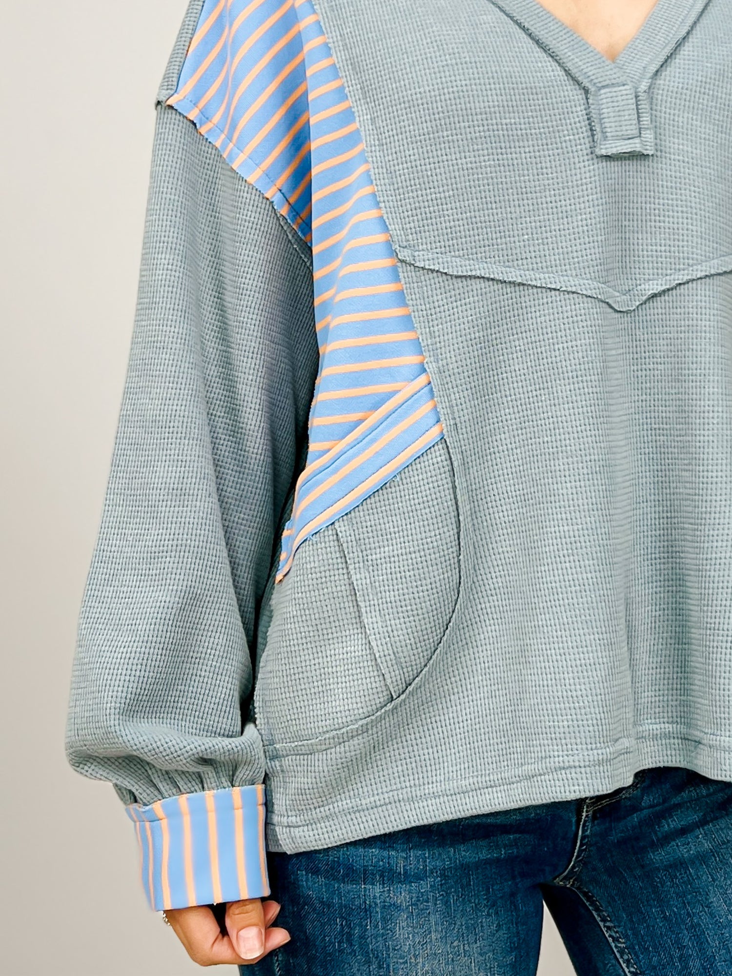 V neck long sleeve roomy fit top in thermal with stripe pattern