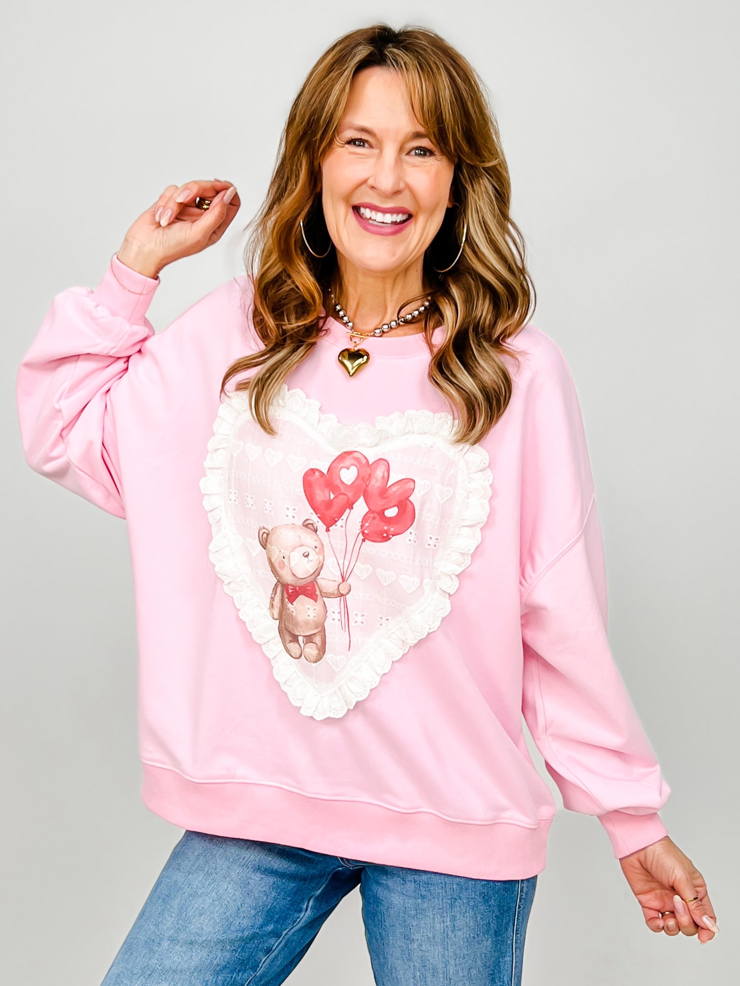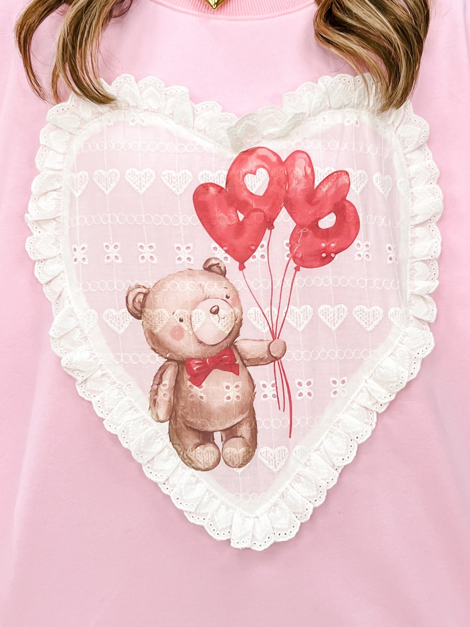 Spread the love this Valentine's season with our adorable bear-printed sweatshirt! Featuring a charming bear design, delicate eyelet detailing, and heart-shaped patches, this cozy pullover adds sweetness and style to your wardrobe. Perfect for expressing your softer side, whether you're celebrating romance or simply embracing all things cute. The comfortable fit makes it ideal for casual days, coffee dates, or snuggling up at home. A playful piece that proves Valentine's vibes can last all year long.