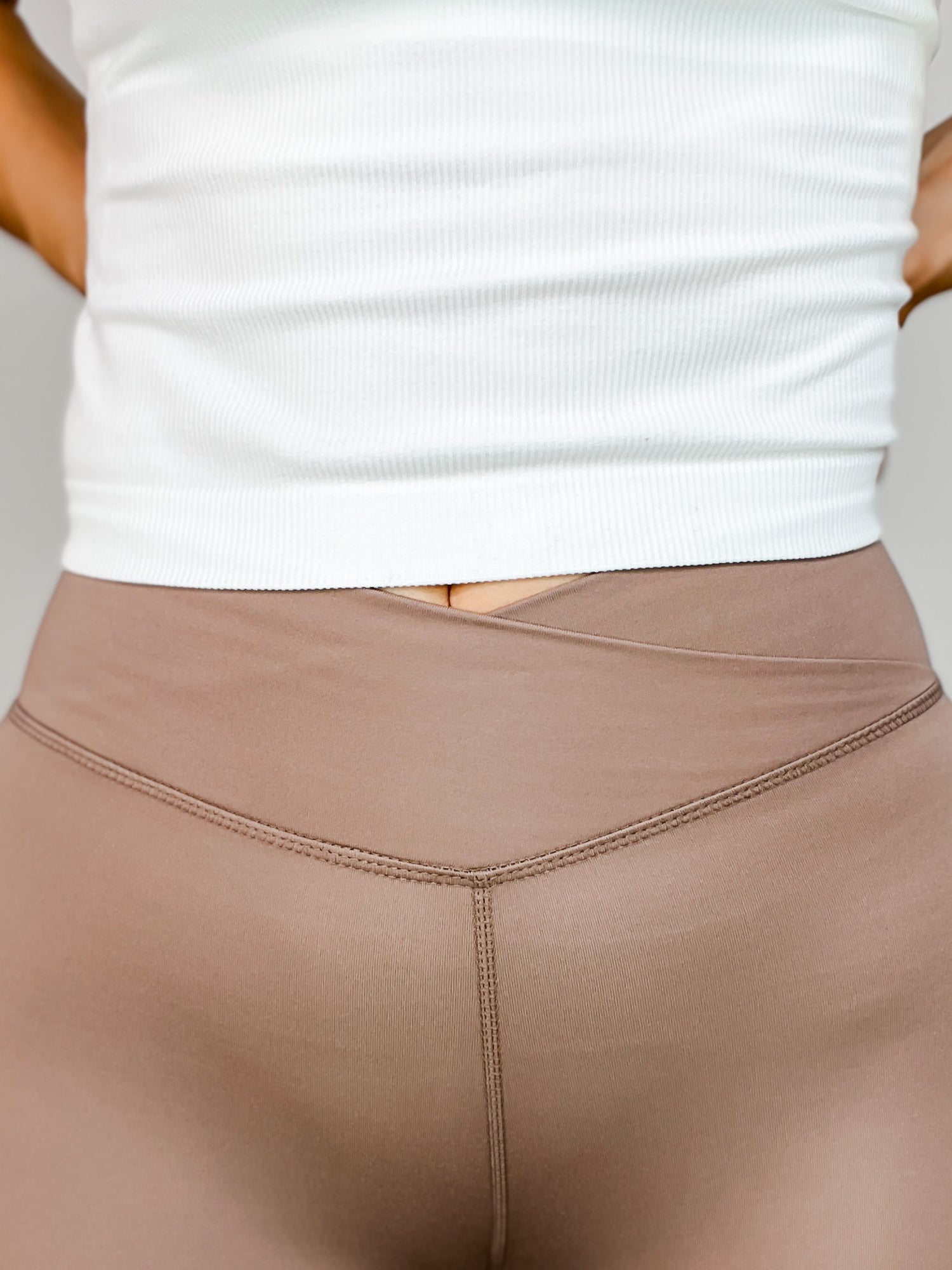 The best-selling crossover front leggings, but now in a core silhouette. With a flattering, tapered waistband, smooth flatlock seaming, and super soft poly/spandex blend fabric, you'll never want to take these leggings off. They feature a laser-cut back pocket and are constructed with no outseam for a minimal look.