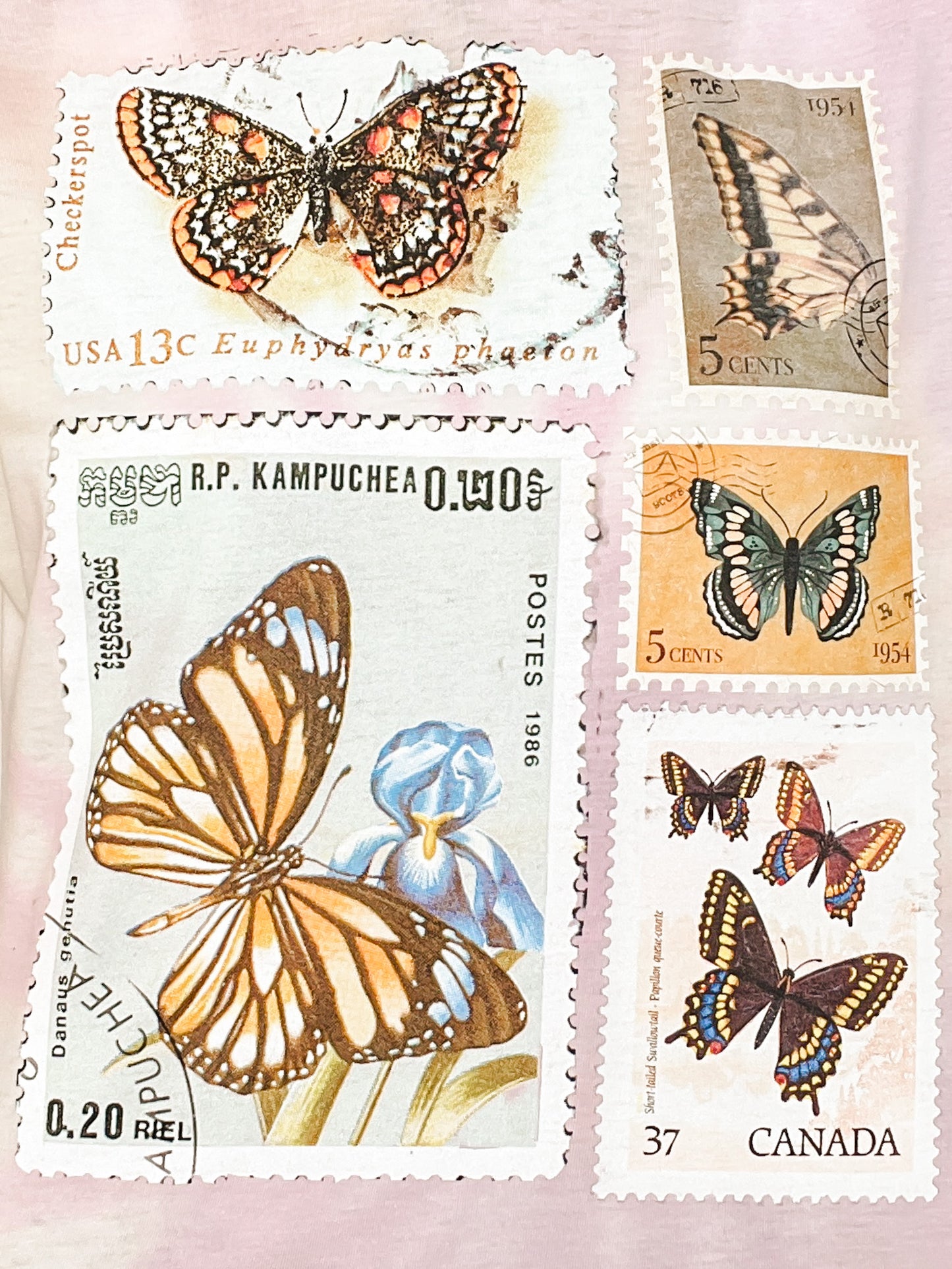 Send a little beauty by mail—or wear it instead. This tee features a dreamy collage of vintage butterfly postage stamps from around the world, fluttering across a soft pink tie-dye backdrop. Made from a 4.3 oz burnout fabric blend of 50/50 ring spun cotton, this tee feels featherlight and broken-in from day one.