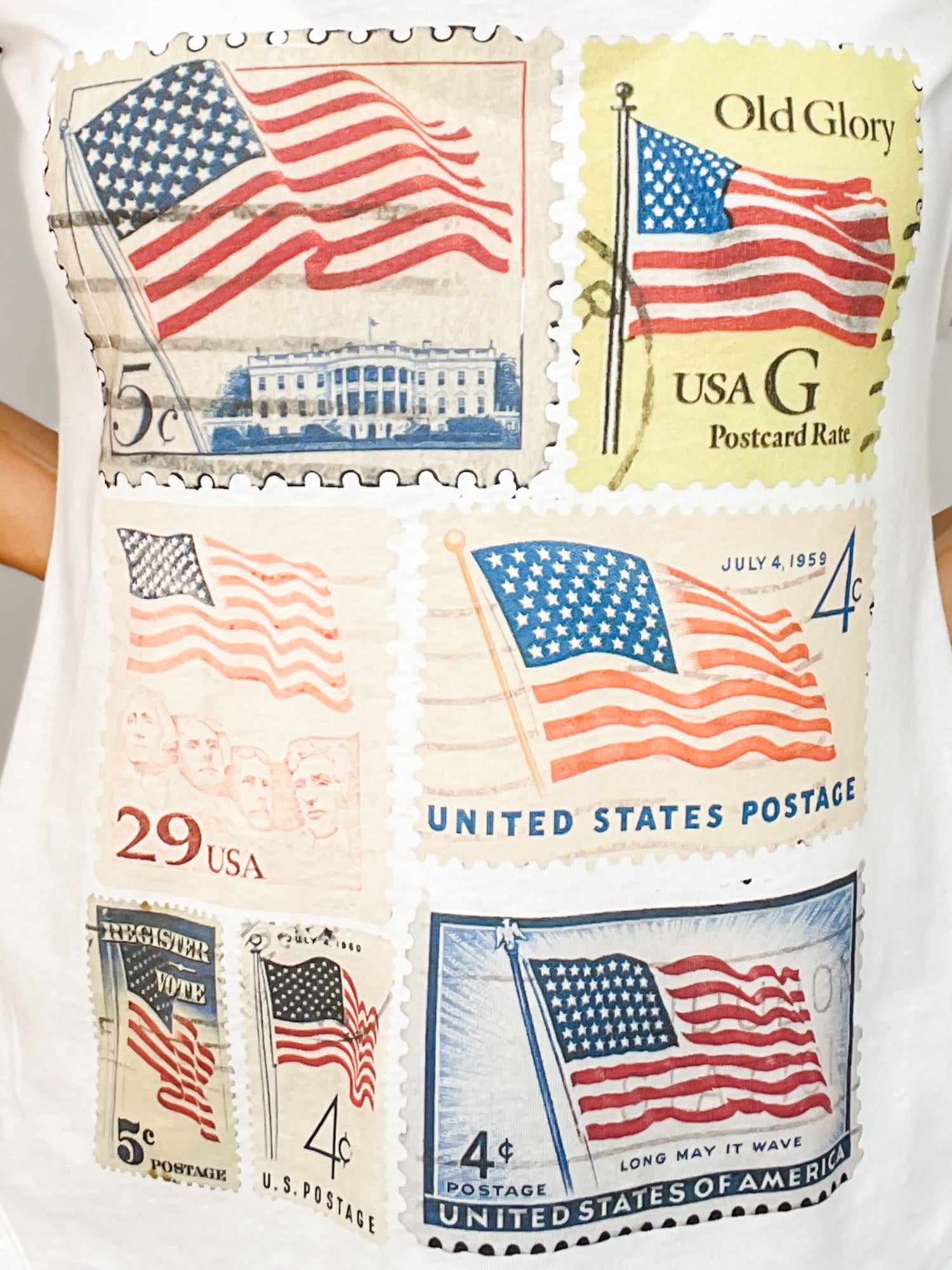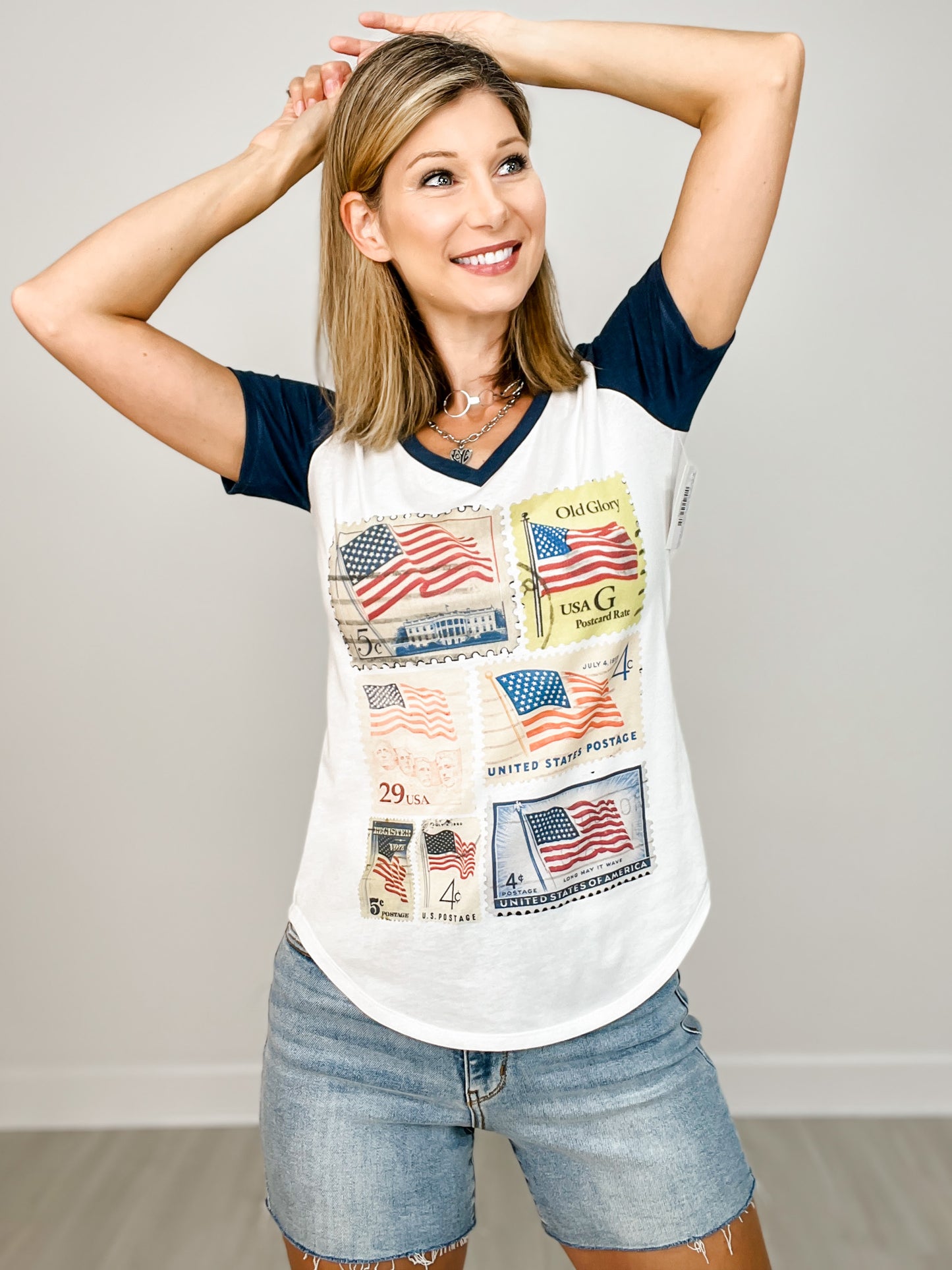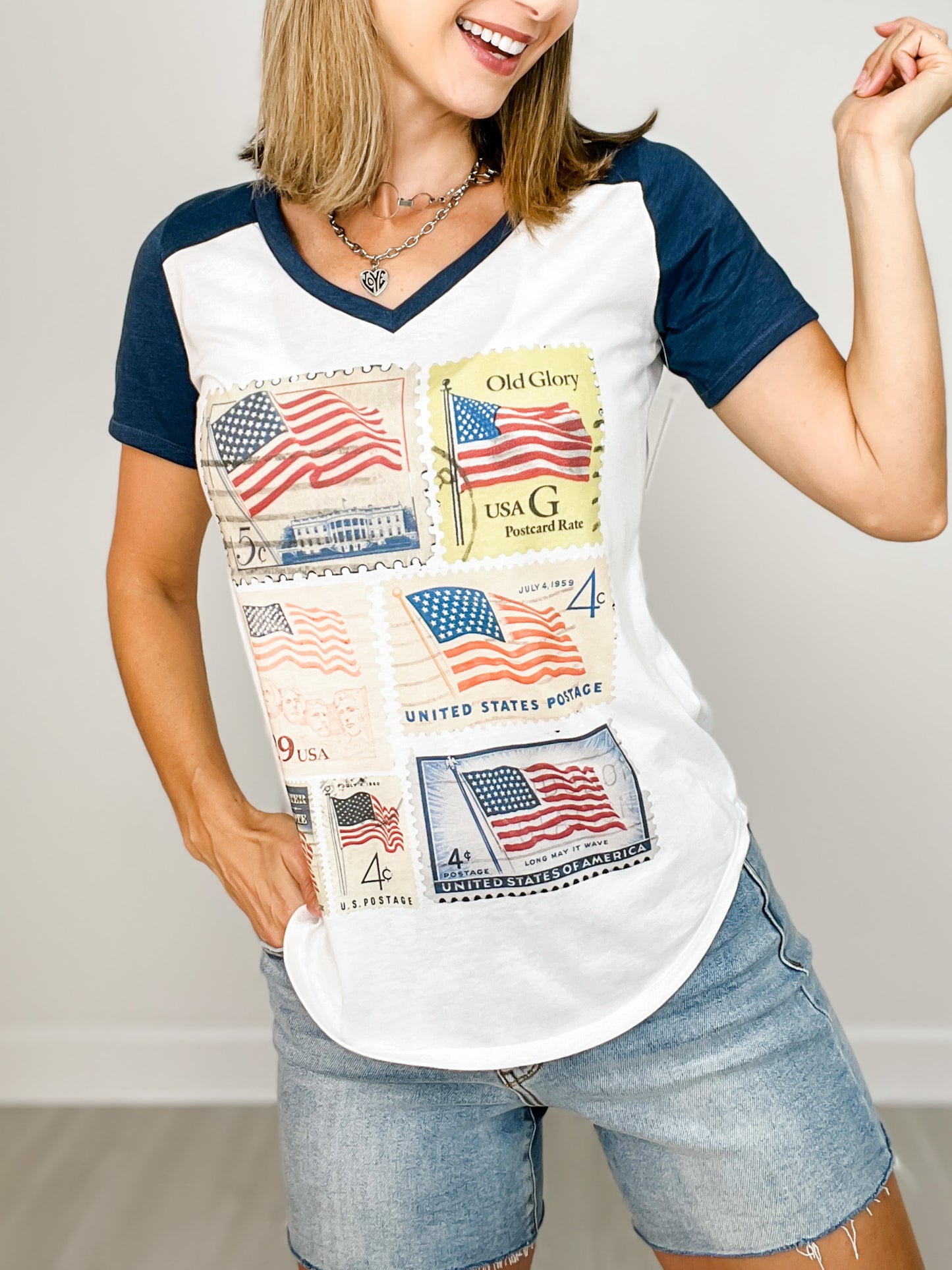 Vintage Patriotic Stamps Vneck Graphic Tee