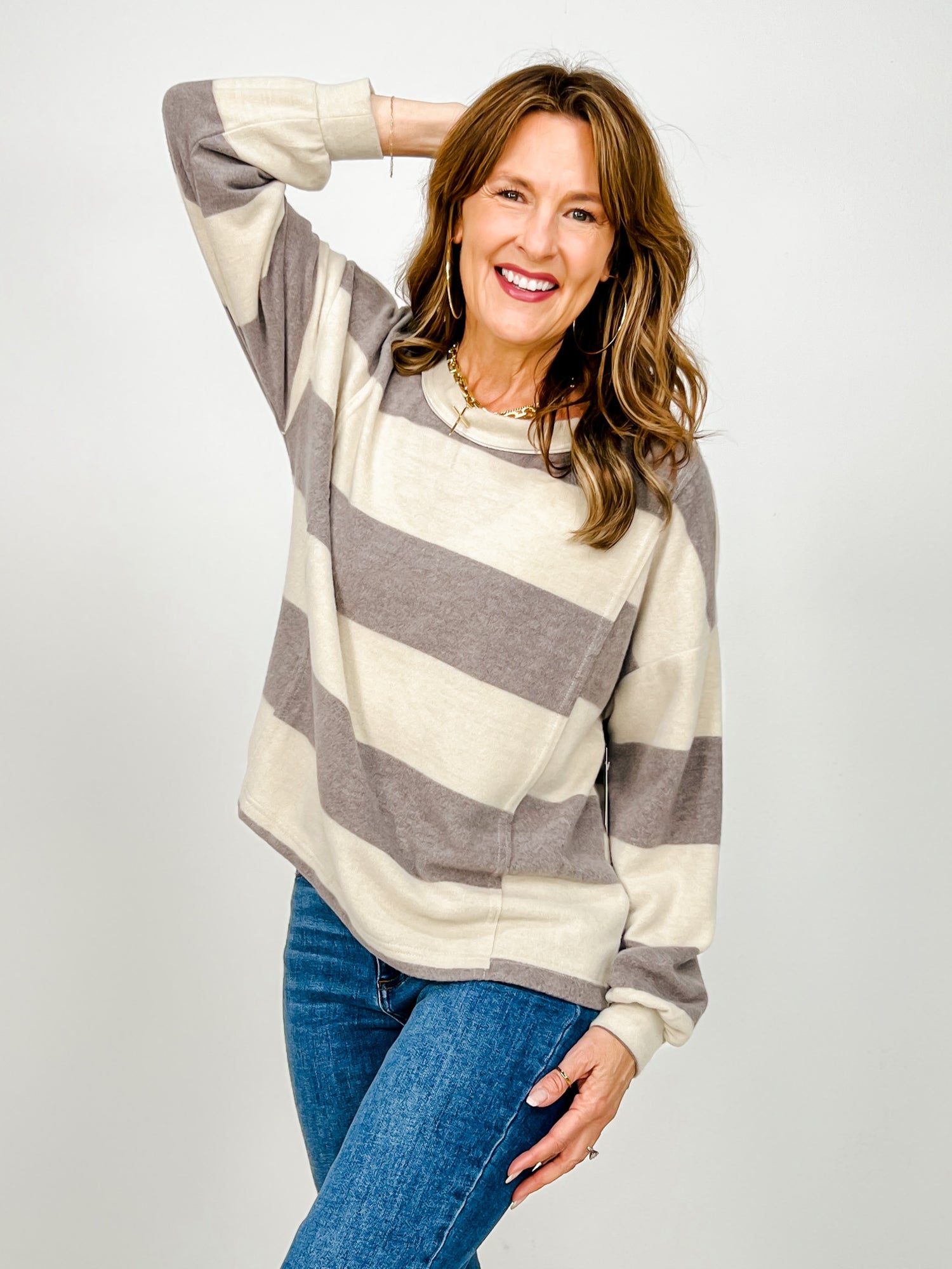 Step into cozy charm with the Washed Stripe Long Sleeve Knit Top. Soft, breathable fabric and playful stripes make it your go-to for casual days or layered looks. With a comfy fit and long sleeves, it’s perfect for adding a splash of fun to your everyday style.