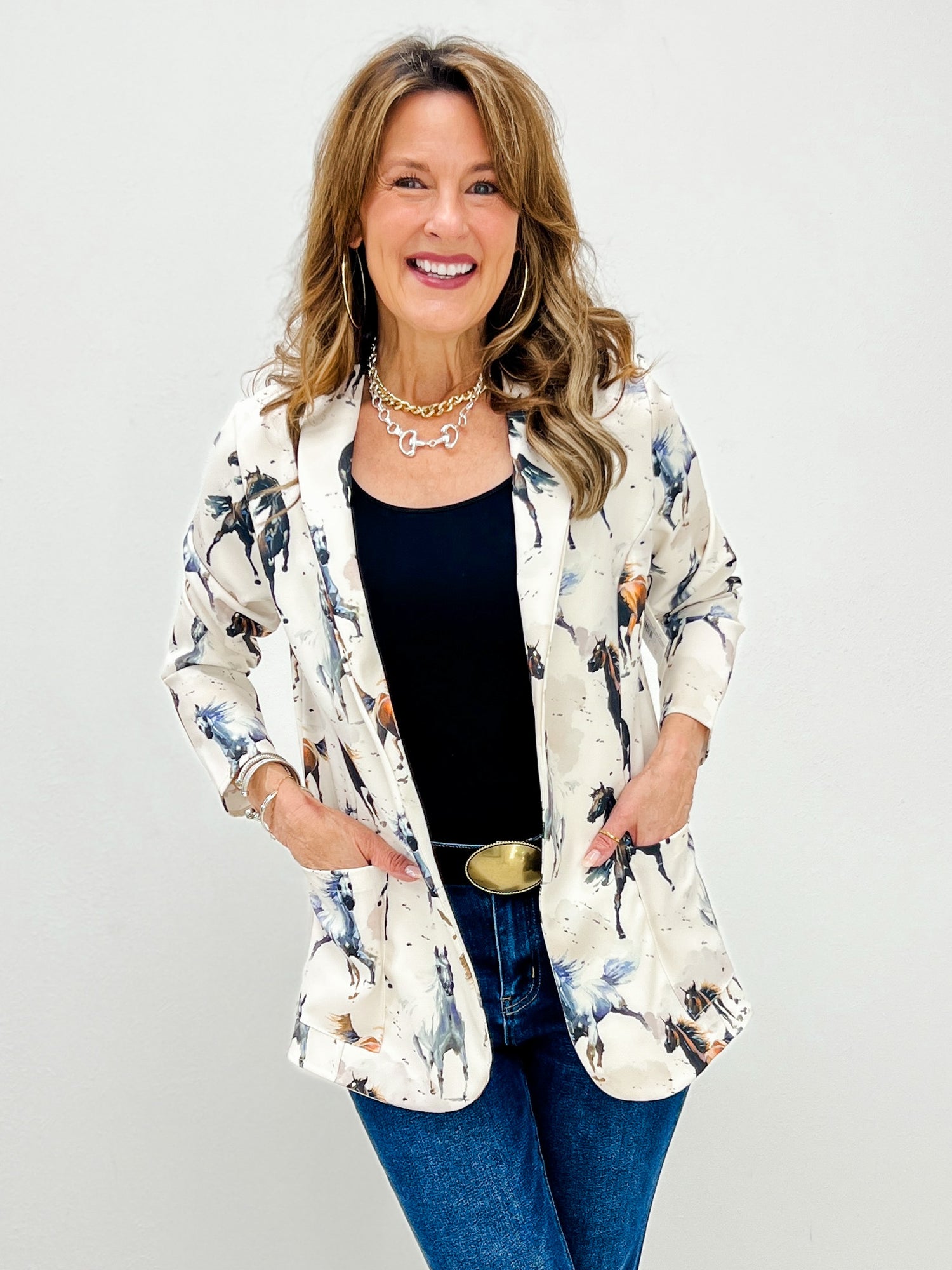 Western Horse Print Woven Blazer with Pocket