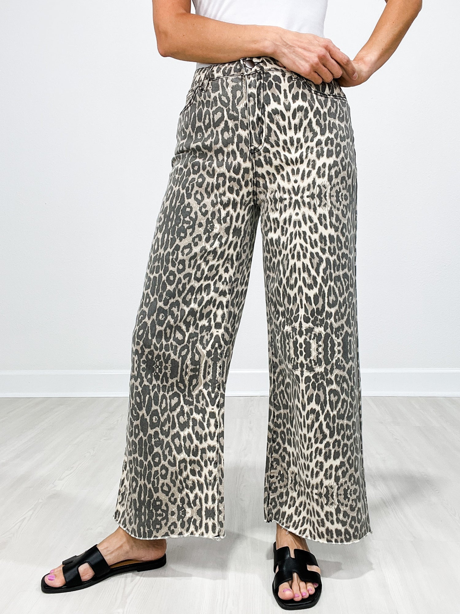 Wide Leg Animal Print Twill Pants with Raw Hem