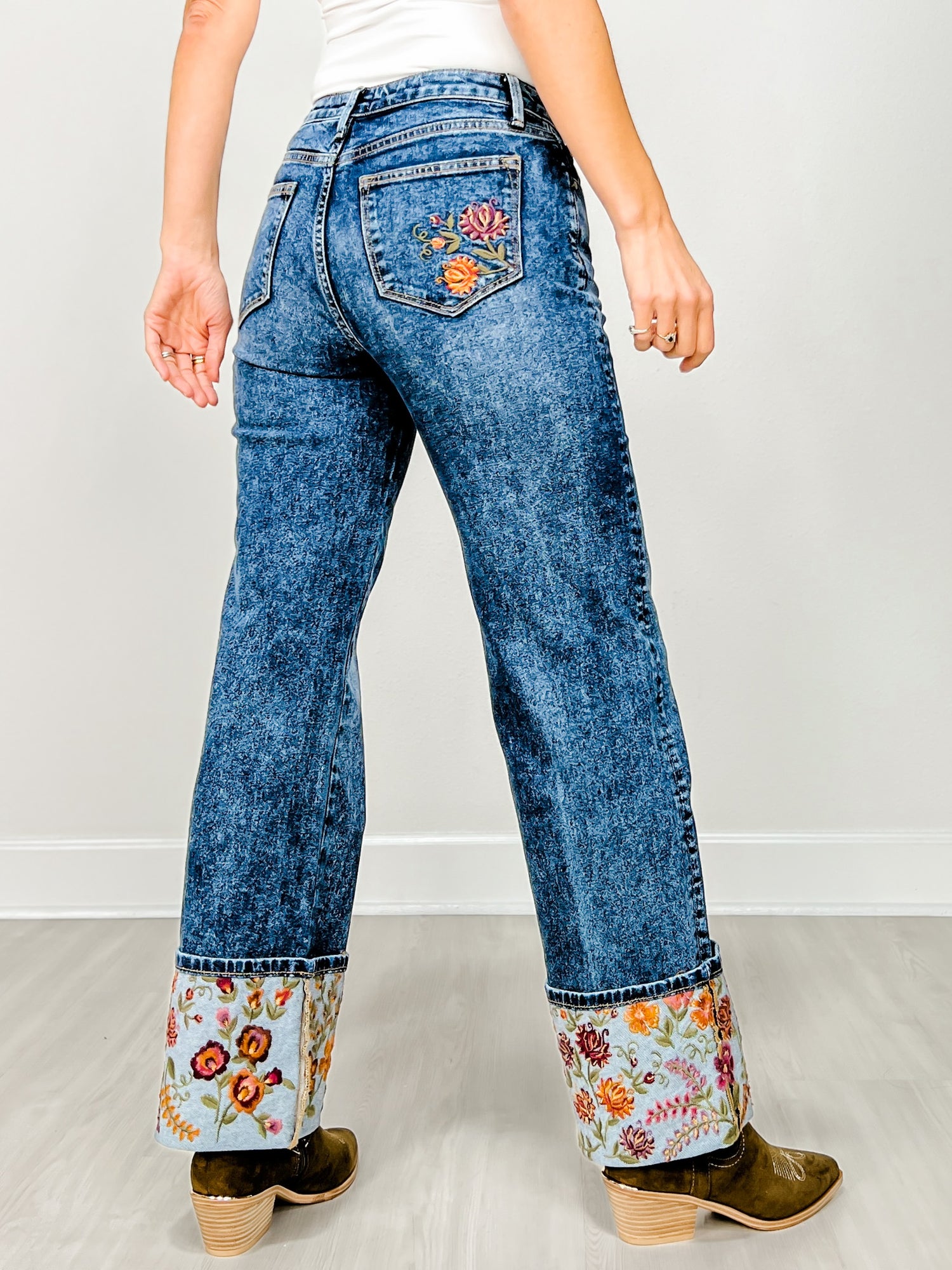 Elevate your denim game with the Charlee Cuff, crafted in a dark wash that’s effortlessly versatile. Inspired by our Oshibana embroidery, this style features delicate floral stitching—but with a playful twist: the embroidery is artfully placed on the exaggerated cuff hem, making every step a statement. A perfect blend of classic denim with eye-catching detail, the Charlee Cuff pairs seamlessly with everything from casual tees to chic blouses.